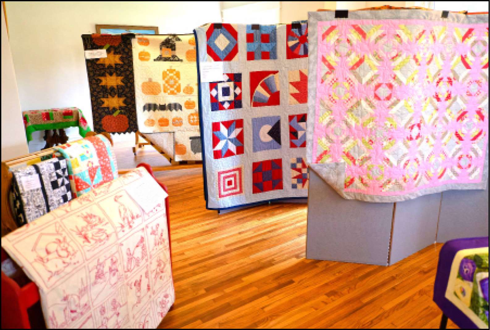 Alongside the quilts, the show included examples of tatting, embroidery, crocheting, braided rugs, and antique sewing equipment, including two early sewing machines and a spinning wheel.
