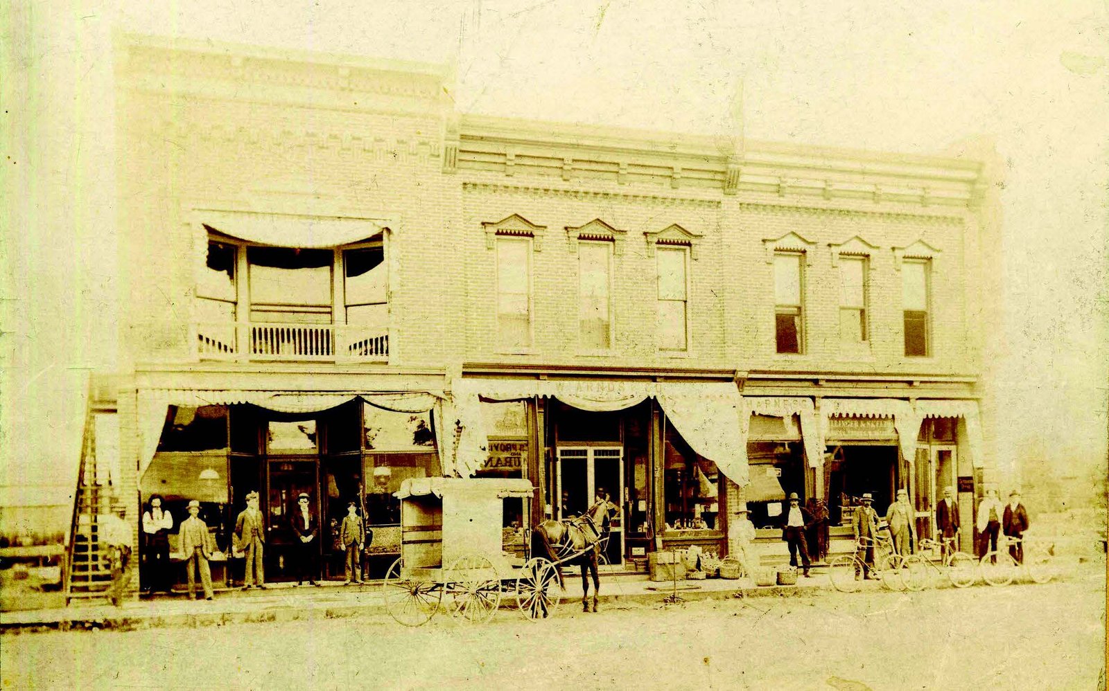 The building on the left doesn’t bear any visible signage, but was later occupied by the Long Drug Company. The center structure housed the Fred W. Arnds & Company grocery, and the building on the right—which no longer stands—was home to Killinger & Skelton, harness makers and dealers, who also sold bicycles.