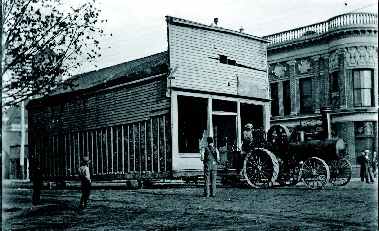 STREETS… One of the features of Bryan during its early “Fountain City” period was wide, unpaved streets that were leveled using a horse-drawn street scraper. This circa 1901 historic photograph shows a steam traction engine moving a wooden frame building on West High Street before the thoroughfare was paved with brick.