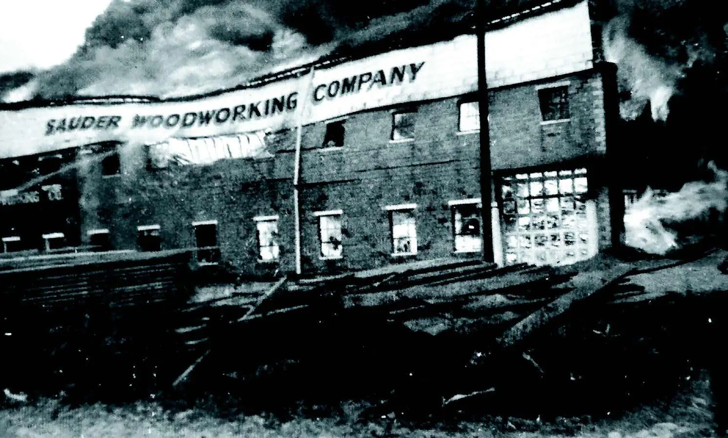 FIRE … The 1945 fire destroyed Sauder Woodworking but not Erie Sauder’s determination. Thank you to the Fulton County Historical Society for the use of this photo. Do you have a Fulton County Historic photo you would like to share? Email: publisher@thevillagereporter.com.