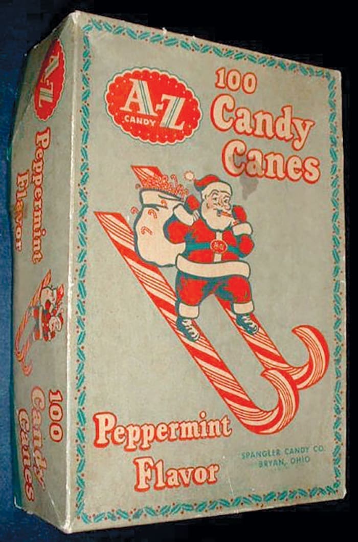 Spangler Candy Company completed its purchase of the A-Z Candy Manufacturing Company of Detroit, a major manufacturer of candy canes at that time. The purchase price was approximately $50,000. A-Z’s candy production equipment was moved to Spangler’s Bryan facility. In the fall of 1954, Spangler was ready for its first Christmas with peppermint candy canes. Today the Spangler Candy Company manufactures 2.7 million candy canes per day. This photo-graph of a vintage A-Z Candy Canes box is from the Kevin Maynard collection.