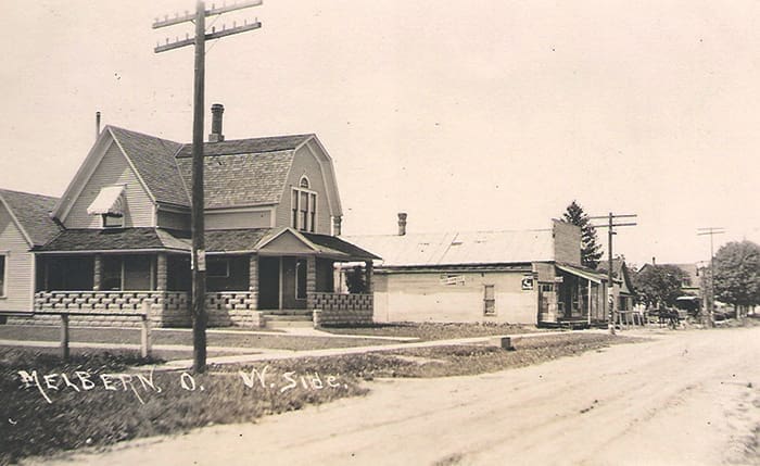 HISTORIC REFLECTION … The village of Melbern in Center Township owes its existence to the railroad. Melbern was originally surveyed as “Kan-sas” on June 27, 1856. The village was platted halfway between Edgerton and Bryan on the north side of the Michigan Southern & Northern Indiana (now Norfolk Southern) Railroad, which reached Bryan in 1855. Kansas doesn’t appear to have grown until the railroad established a station there early in 1866. In 1869, the village was replatted and christened Melbern, the same name as the post office established there on March 16, 1866. By 1874 Melbern boasted two stores, a cooper (barrel maker), blacksmith shop, doctor’s office, post office, railroad depot, sawmill and a Lutheran church. Melbern contained at various times a shoe shop, Grange hall, cheese factory, saloon, school, stock yard, grain elevator, coal busi-ness, barber shop, and butcher. Transportation advances such as improved roads and automobiles led to the decline of the railroad’s local importance and business. Melbern still has an active United Methodist church, but the numerous busi-nesses that once made it a bustling rural economic center are gone. This circa 1910 photograph shows the west side of Melbern’s Main Street (County Road 9) looking north from the railroad. The residence on the left still stands. This vintage image is from the Kevin Maynard collection.