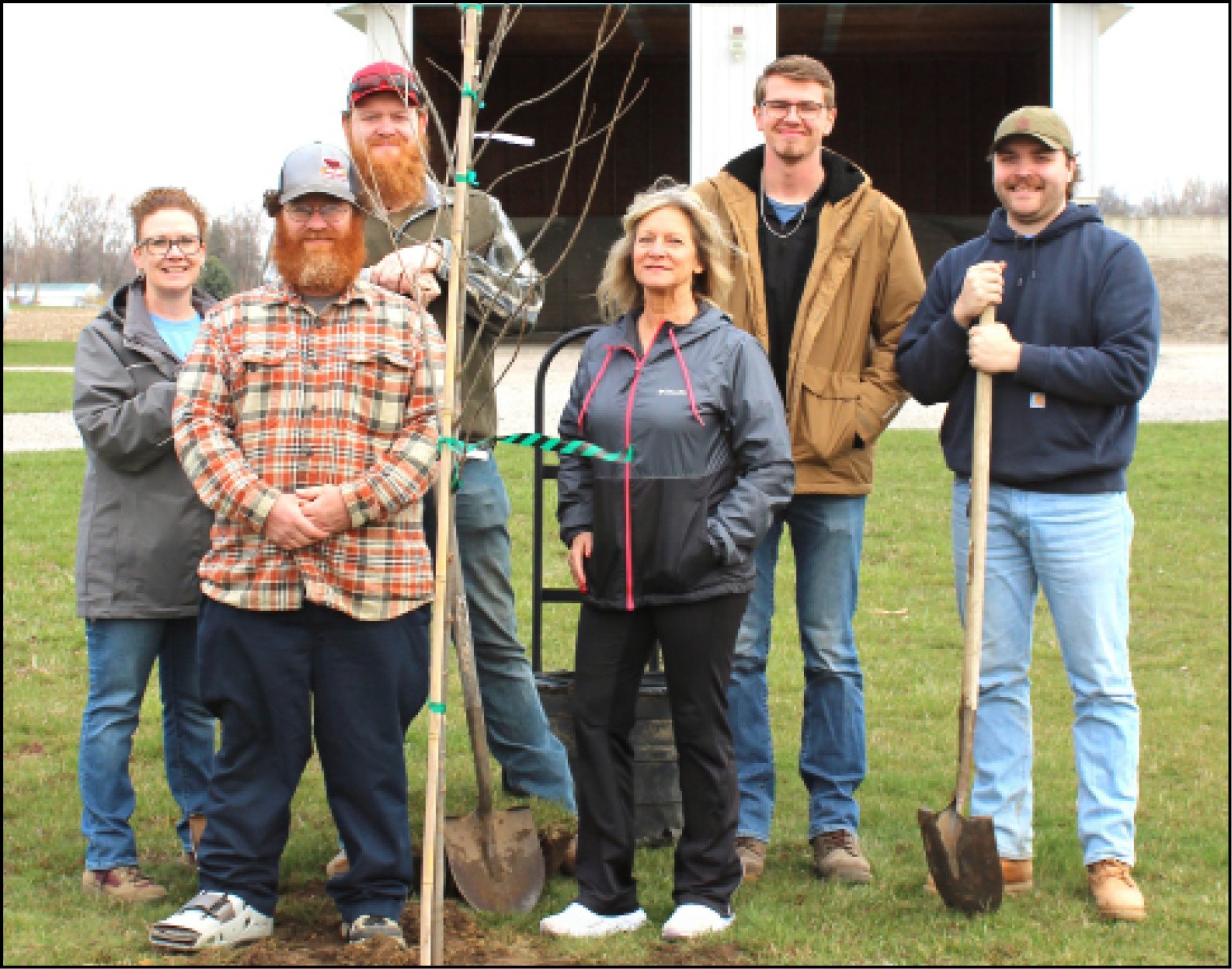 FINISHED PRODUCT … Fulton Soil & Water Conservation District staff (back row, from left to right) Amanda Podach, Harmon Gombash, Cole Plassman and Matthew Buchhop planted a Princeton elm at the Dover Township maintenance building. They are joined (front row, from left to right) by Dover Township Trustee Brett Wyse and Fiscal Officer Dianne Valentine. Twelve trees were planted in each Fulton County township in honor of its 175th birthday.