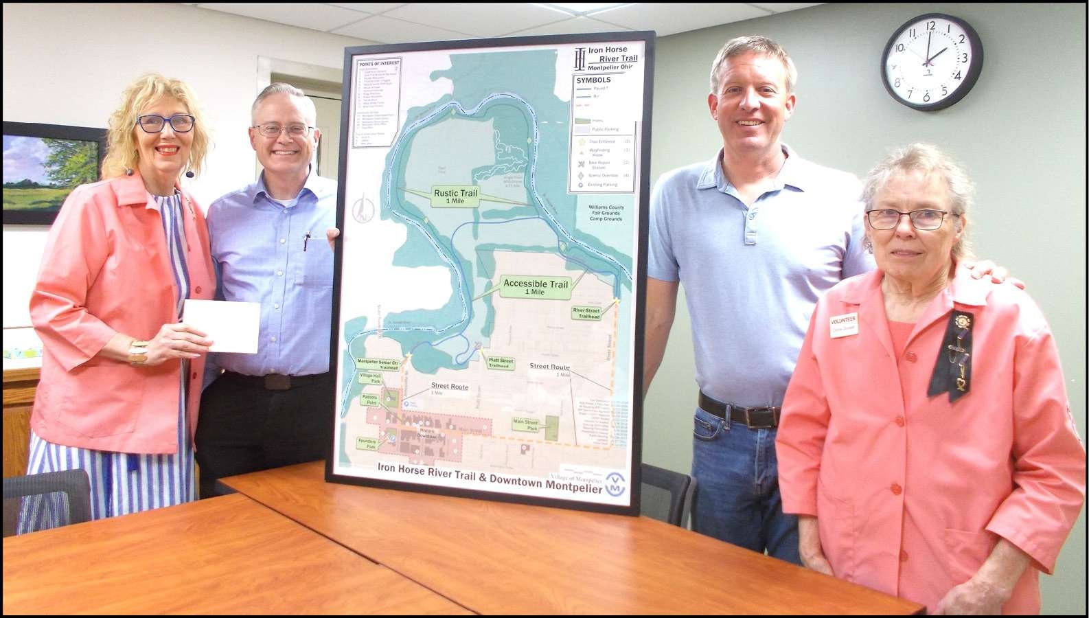 DISCUSSING THE TRAIL … Montpelier’s Iron Horse River Trail was the topic presented at the Parkview-Montpelier Hospital Auxiliary meeting Monday, May 12th by guest speakers Nathan Thompson and Chris Kannel, Montpelier Village Councilmen. Shown with the trail map are from left to right—Auxiliary President Linda Dilworth, Chris Kannel, Nathan Thompson, and Auxiliary Secretary Connie Dunseth.