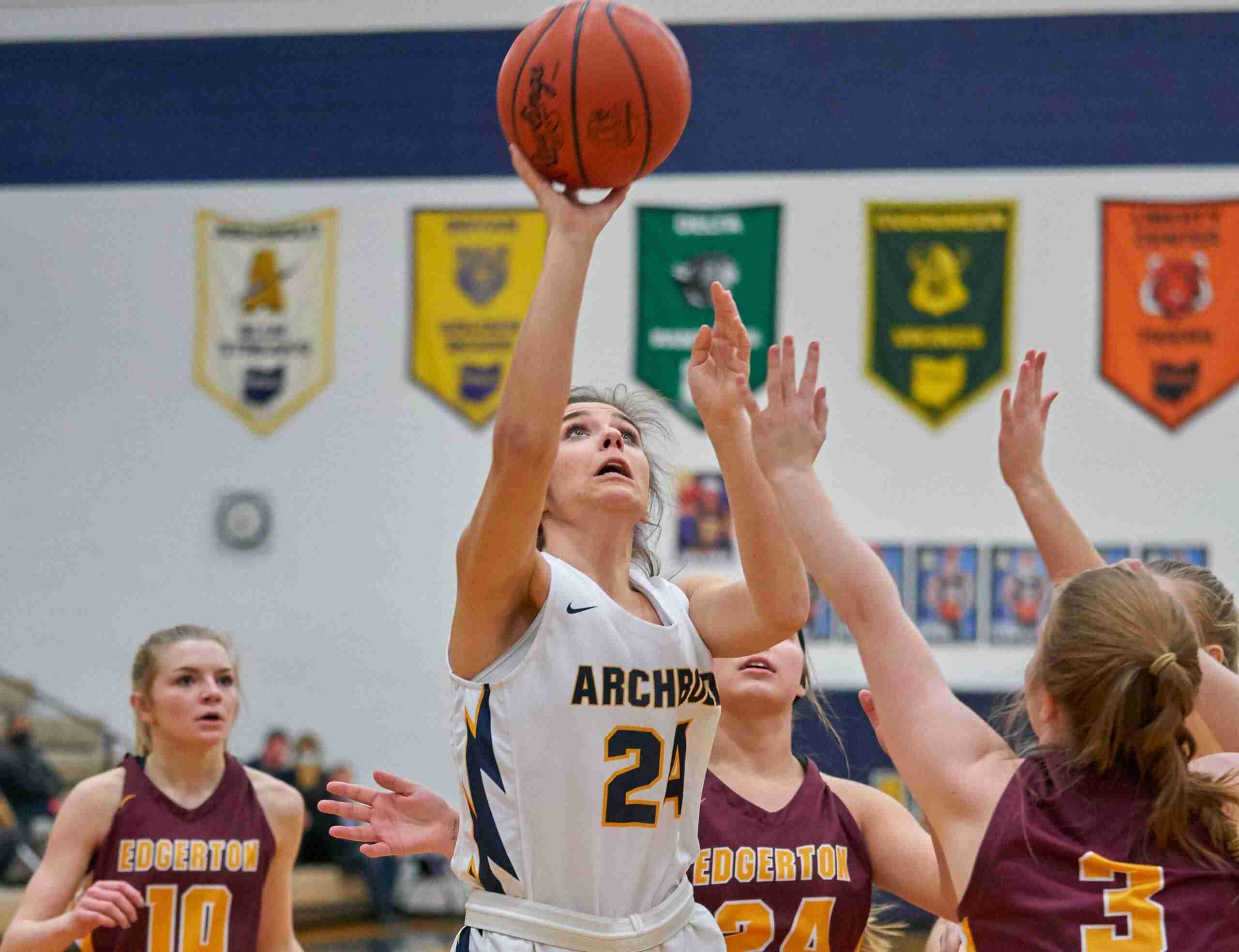Addie Ziegler scores two of her 12 points to lead Archbold to 58-14 win over Edgerton. (PHOTO BY RICH HARDING, STAFF)