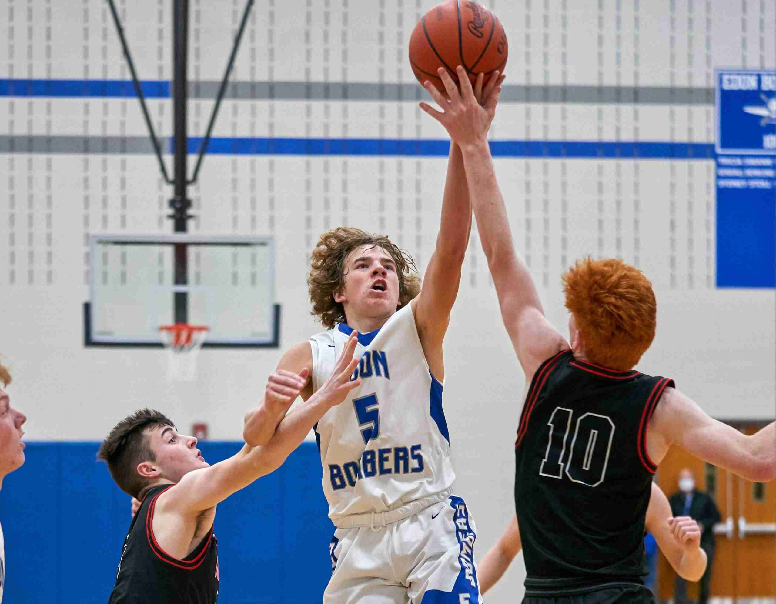 Edon’s Dawson Kiess launches a shot while Cohen Meyers (#10) of North Central goes for the block. (PHOTO BY RICH HARDING, STAFF)