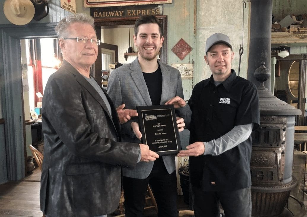 JANUARY RECIPIENT … Pictured are Dr. John Trippy, owner, Ben Adams, board member of Bryan Development Foundation, and Joh Wheeler, manager of Third Rail Saloon. (PHOTO PROVIDED)