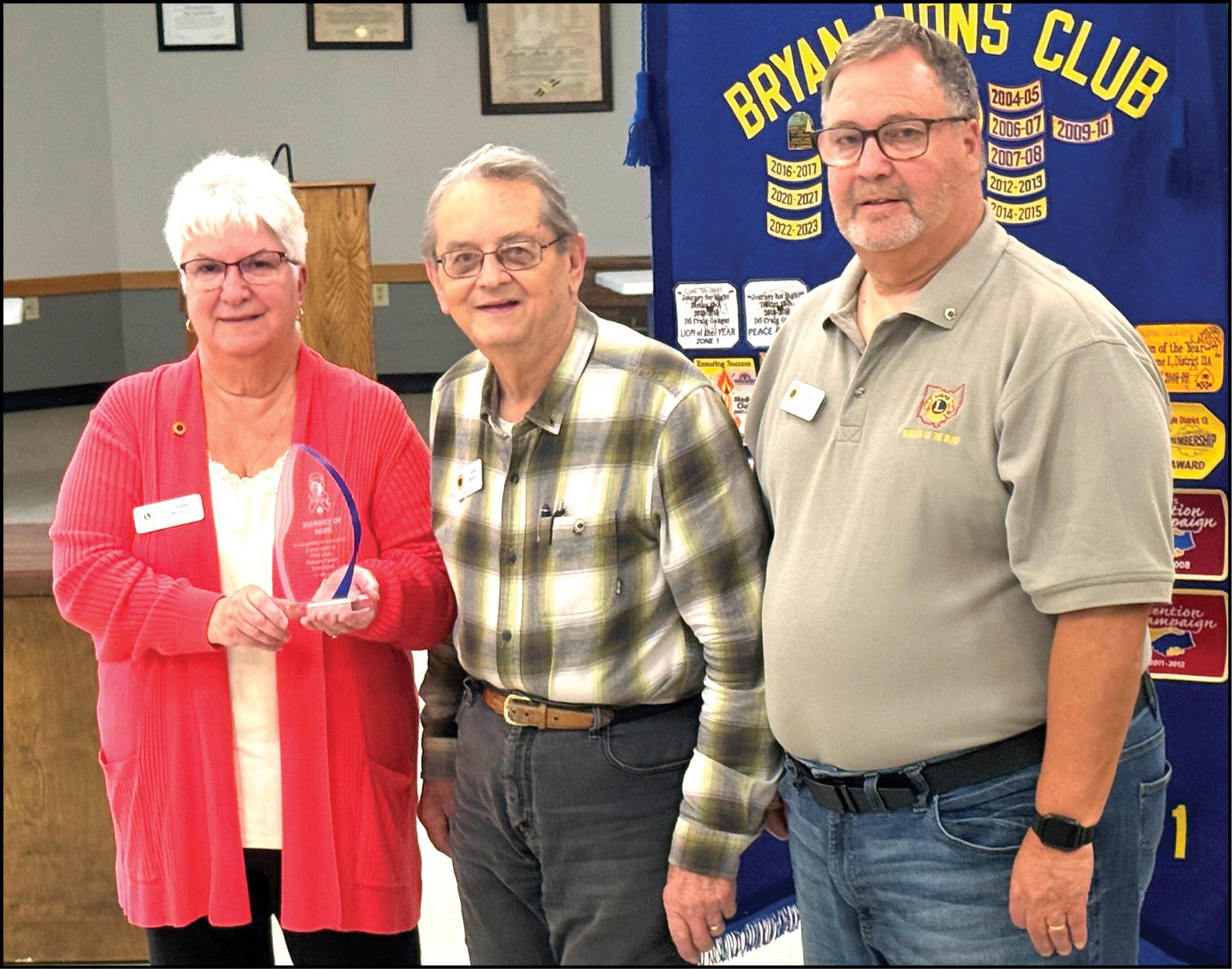 AWARD RECIPIENTS … John and Jo Moats (left and center) received the Journey of Hope Award from Bryan Lions Club President Larry Harsila (right) during the club’s April 22 meeting.