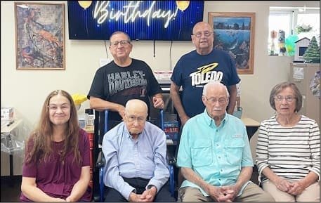 STRYKER SENIOR CENTER … July Birthdays – Front row: Thelma Spieth, Bill Brown, Wayne Nofzinger, Ruthana Nofzinger: Back row: Ray Leal, Tim Oberlin.