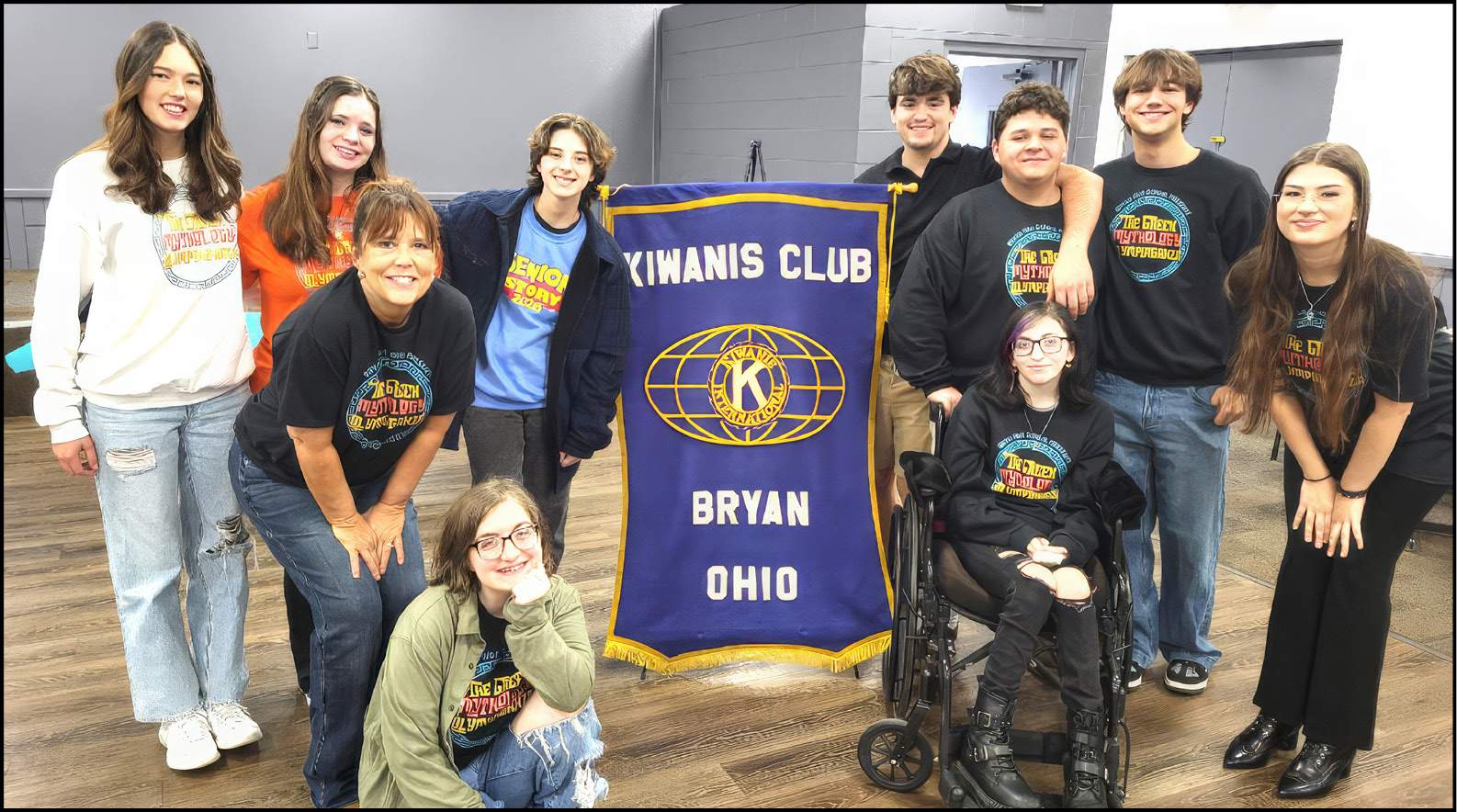 PLAY PREVIEW … The Kiwanis Club of Bryan welcomed a small portion of the cast from the spring play at Bryan High School entitled “The Green Mythology Olymplagranza”. The students performed a scene from the play for the club. Pictured left to right front row: Rose Helf and Emory Ehrhart. Middle row – Lara Knight (Asst. Director), Grason Butler, and Emily Knight (Director). Top row – Emma Schlade, Harlie Blankenship, Jaen Kaullen, Josef Durbin, and Noah Mills.