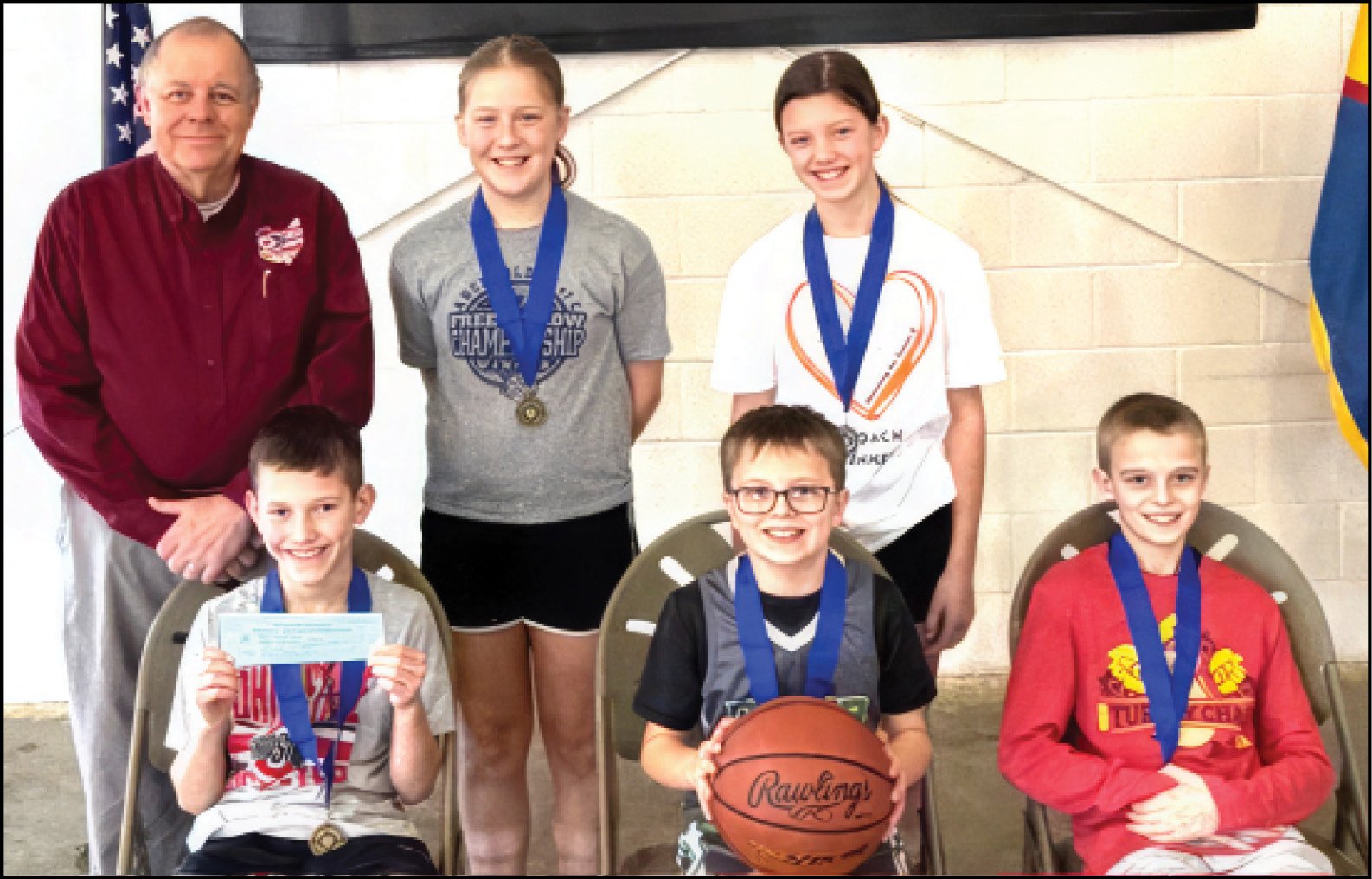 MEDAL WINNERS … Seated( l-r) Wade King, Carson Baden, Eli King. Standing (l-r) Mike Boff (K of C District Deputy), Madison Mignin, Audrey Plassman.