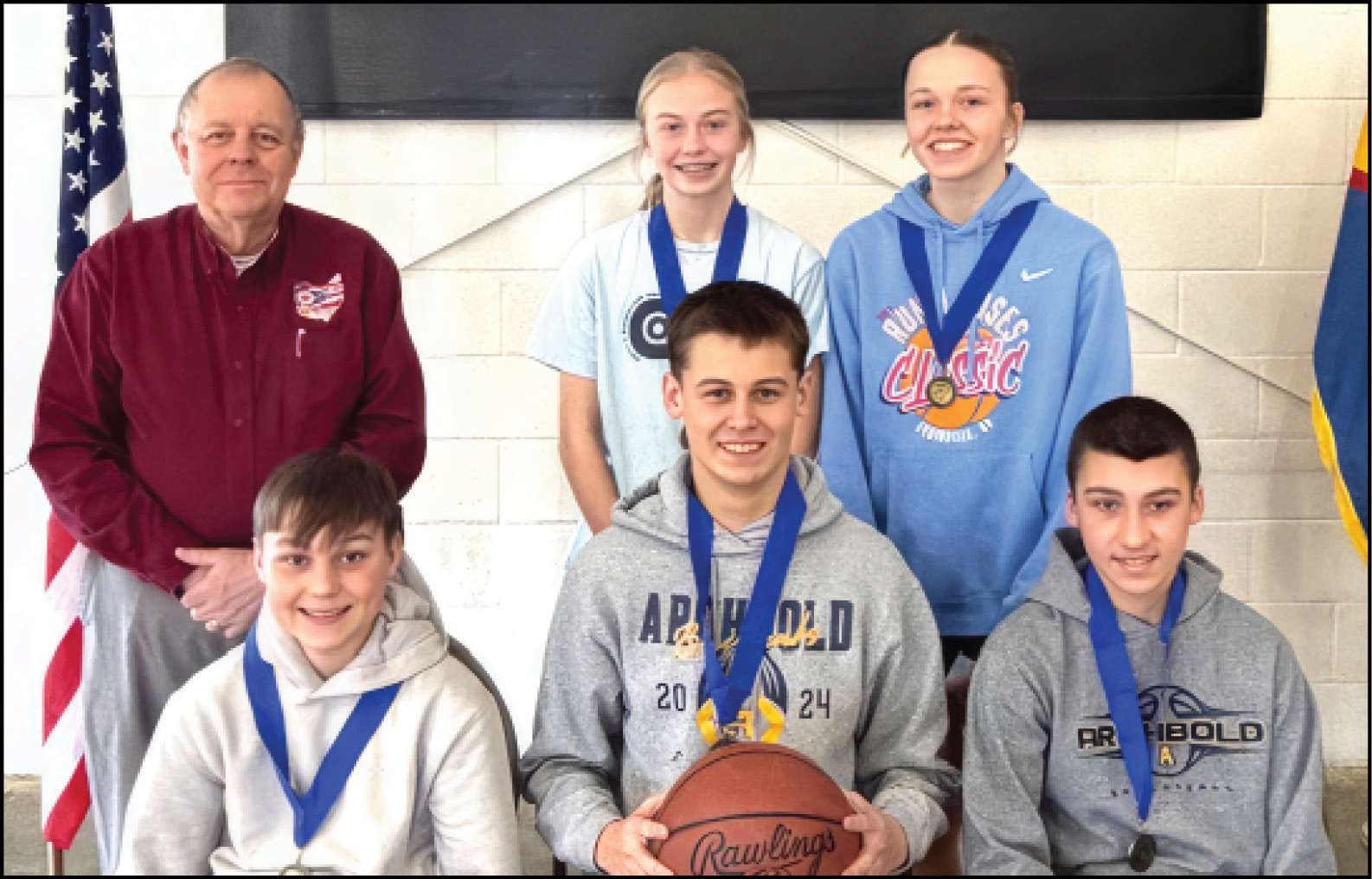 FREE THROW CONTEST … On Sunday February 1st St. Caspar K of C hosted the Knights of Columbus District #57 Free Throw Contest. District #57 is comprised of K of C councils in Archbold, Napoleon, Swanton and Wauseon. Competitors, age 9-14, qualified by winning at the local competitions. Pictured below are the medal winners who will now advance to Toledo Diocese regional competition in Ottoville on Sunday February 22nd. Seated (l-r) – JD Holdgreve, Jarren Gorsuch, Simon Allen. Standing (l-r) Mike Boff (K of C District Deputy), Audra Pinter, Lainey Holdgreve.