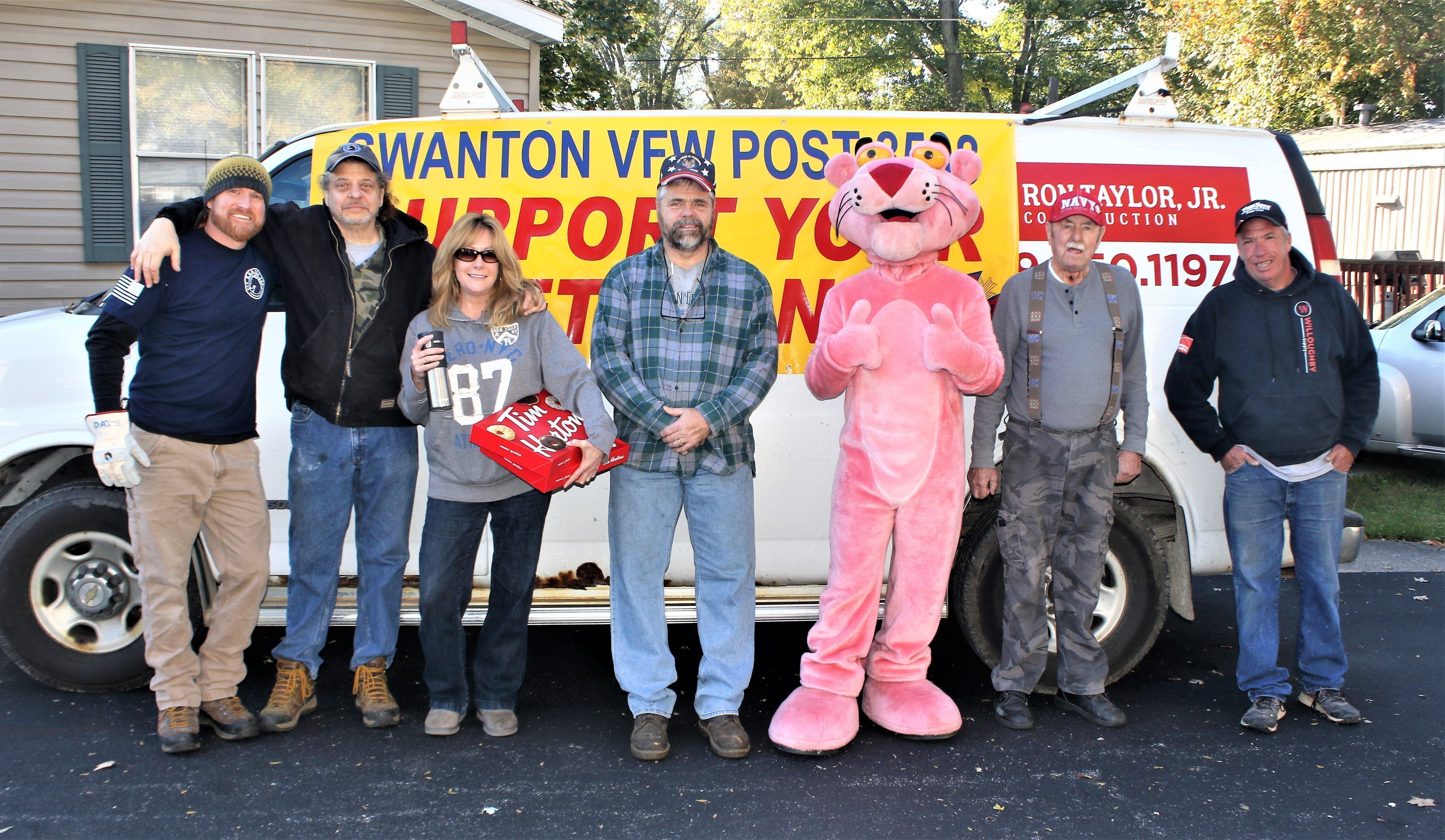 RAISING THE ROOF … Team Taylor volunteers (L to R) – Justin Held, Jim Kenzie, Laurie Heinze, Jeff Powers, OC’s Pink Panther, Larry Galusha and Ron Taylor.