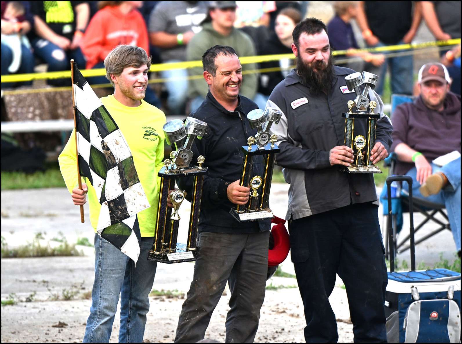 CHAMPIONS… The top 3 stand with their trophies after round 2 of the demolition derby.