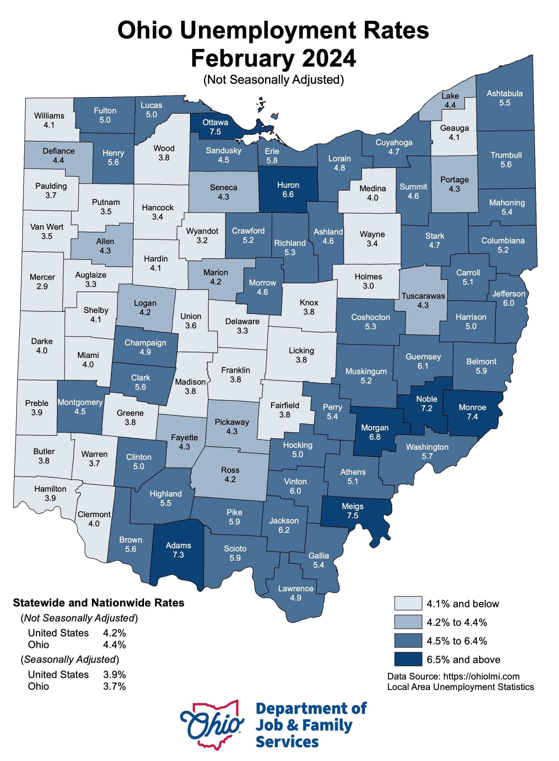 February 2024 numbers increased to 4.4% for Defiance County, 5.6% for Henry County, 3.8% for Wood County, and 7.5% for Ottawa County. Ottawa County is tied with Meigs County for the highest unemployment numbers in the state.