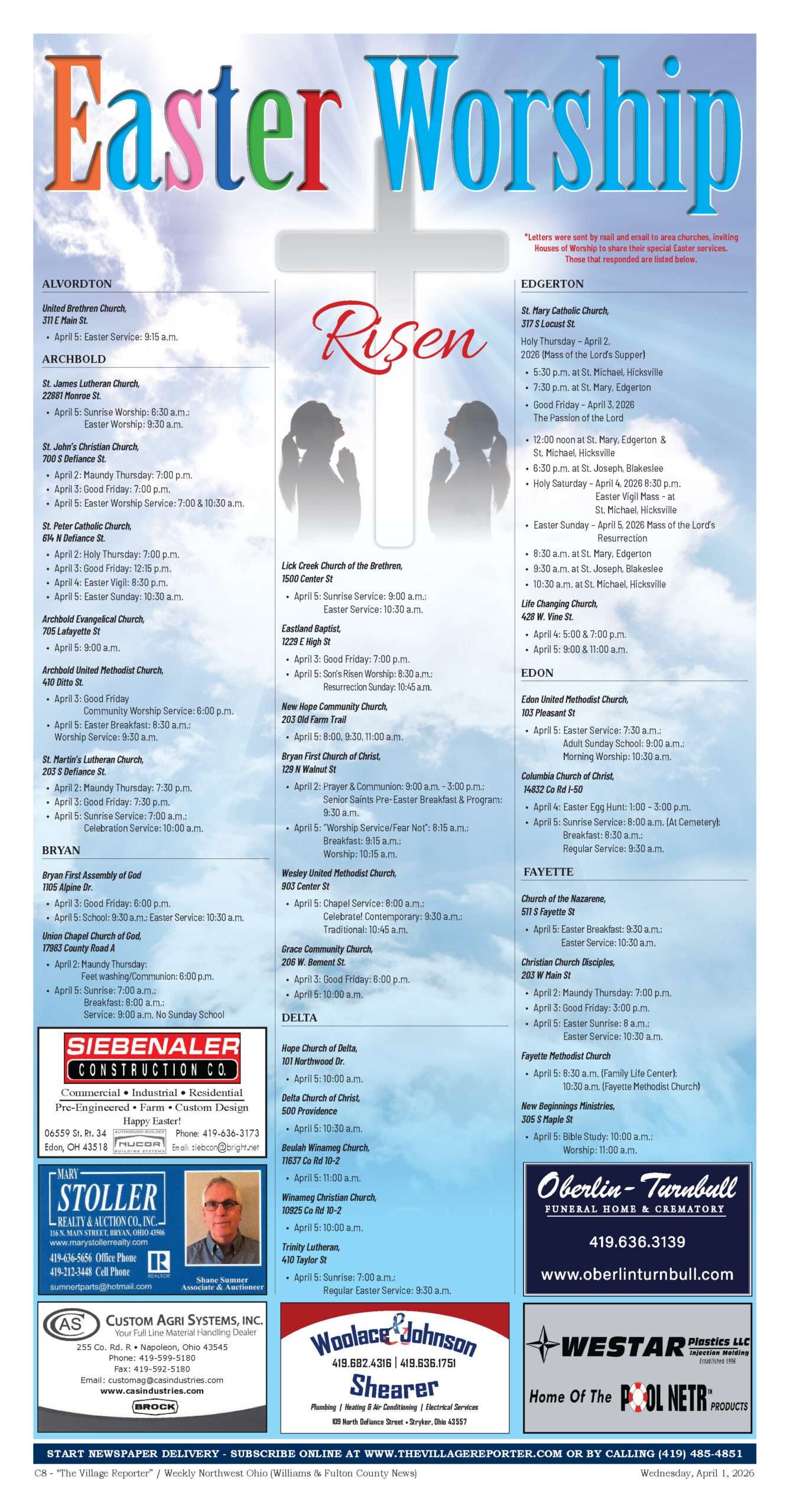 The Village Reporter contacted area churches by mail and email, inviting Houses of Worship across Williams and Fulton Counties to share their special Easter services for 2026. The Houses of Worship that responded are listed below, organized by community.