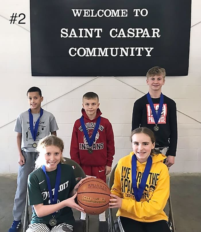 FREE THROW CONTEST … On Sunday February 4th, St. Caspar K of C hosted the Ohio Knights of Columbus District #57 (Archbold, Defiance, Napoleon, St. Caspar-Wauseon and Swanton) Free Throw Contest. Congratulations to these contestants who will now advance to Regional competition on February 25th in Ottoville. Pictured above are seated: Berkley Rolon, Lilah Brown, Presley Wyse. Standing: Toby Coolman, Kyler Bergman, Carson Baden. Shown below are seated: Hayden Cymbolin, Lilly Zeedyk. Standing: Jayden Mendoza, Kowen Carroll, Tripp Langenderfer.