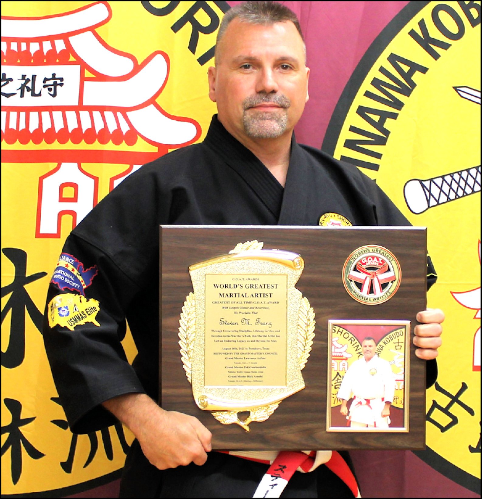 PRESS RELEASE – Steven M. Franz, Kyoshi, a multi-time world martial arts champion, 7th Degree Black Belt, and highly respected mentor, has been awarded the prestigious G.O.A.T. Martial Arts Award—one of the highest honors within the international martial arts community.