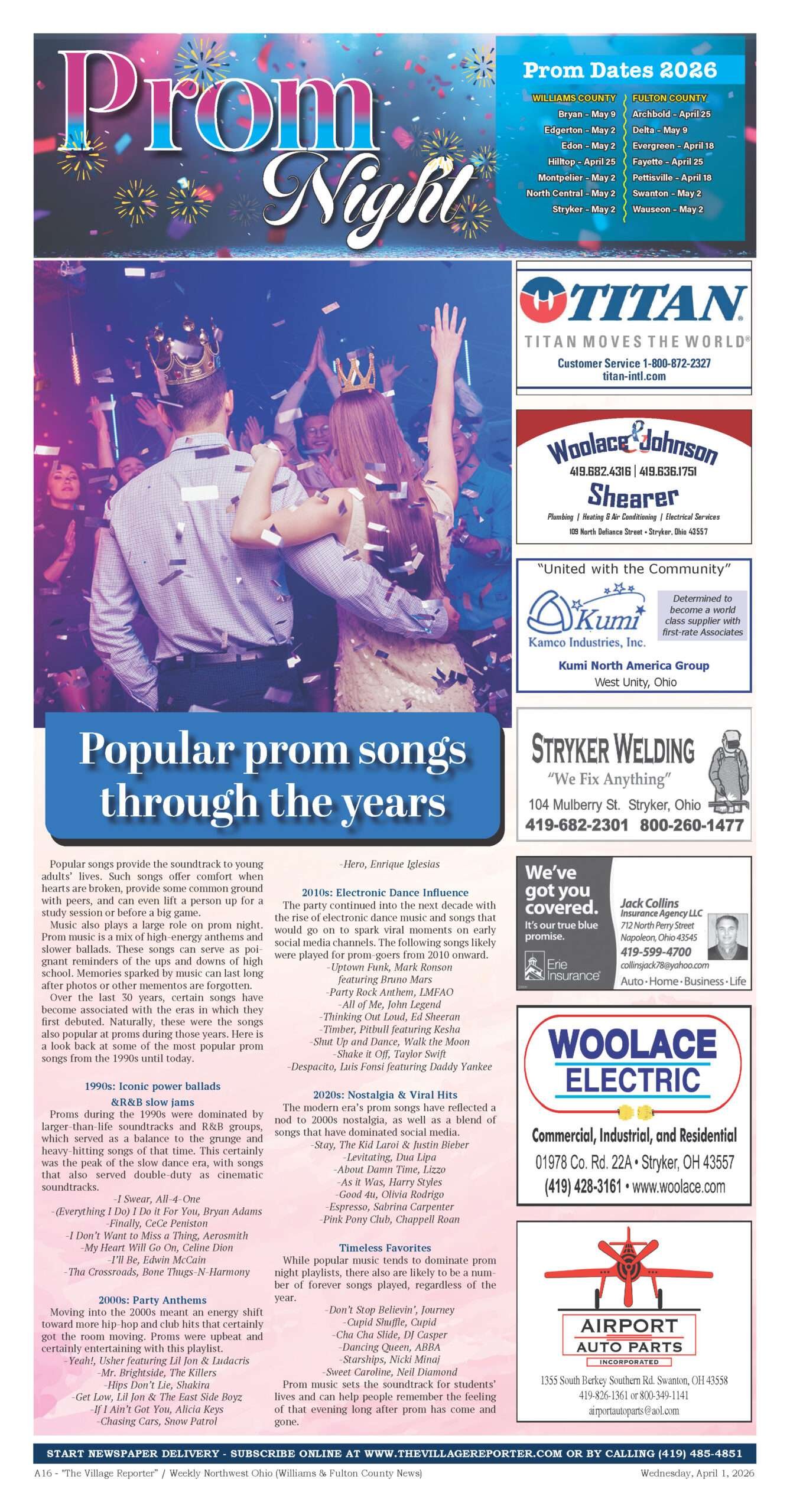 Prom season is here across Williams and Fulton Counties! The Village Reporter’s Prom Night guide features all the 2026 prom dates for area high schools, plus tips on making the most of the evening — from getting ready and pre-prom gatherings to after-party plans — along with a look back at the most popular prom songs through the decades.