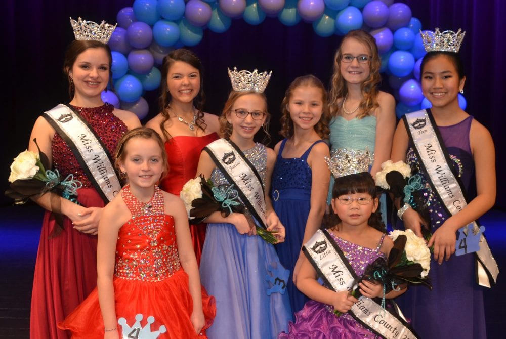 23 local queens from their respective towns wore their shiny, flowing and winter’s best to vie for a title in their respective categories at the Pride of Williams County pageant that was held on January 15th at the Arts & Education Auditorium in Bryan. The pageant director’s from West Unity, Pioneer, Bryan, Edgerton, Edon and Montpelier helped their Misses, Junior Misses, Teen Misses and Little Misses look, speak and walk their best for the judges.