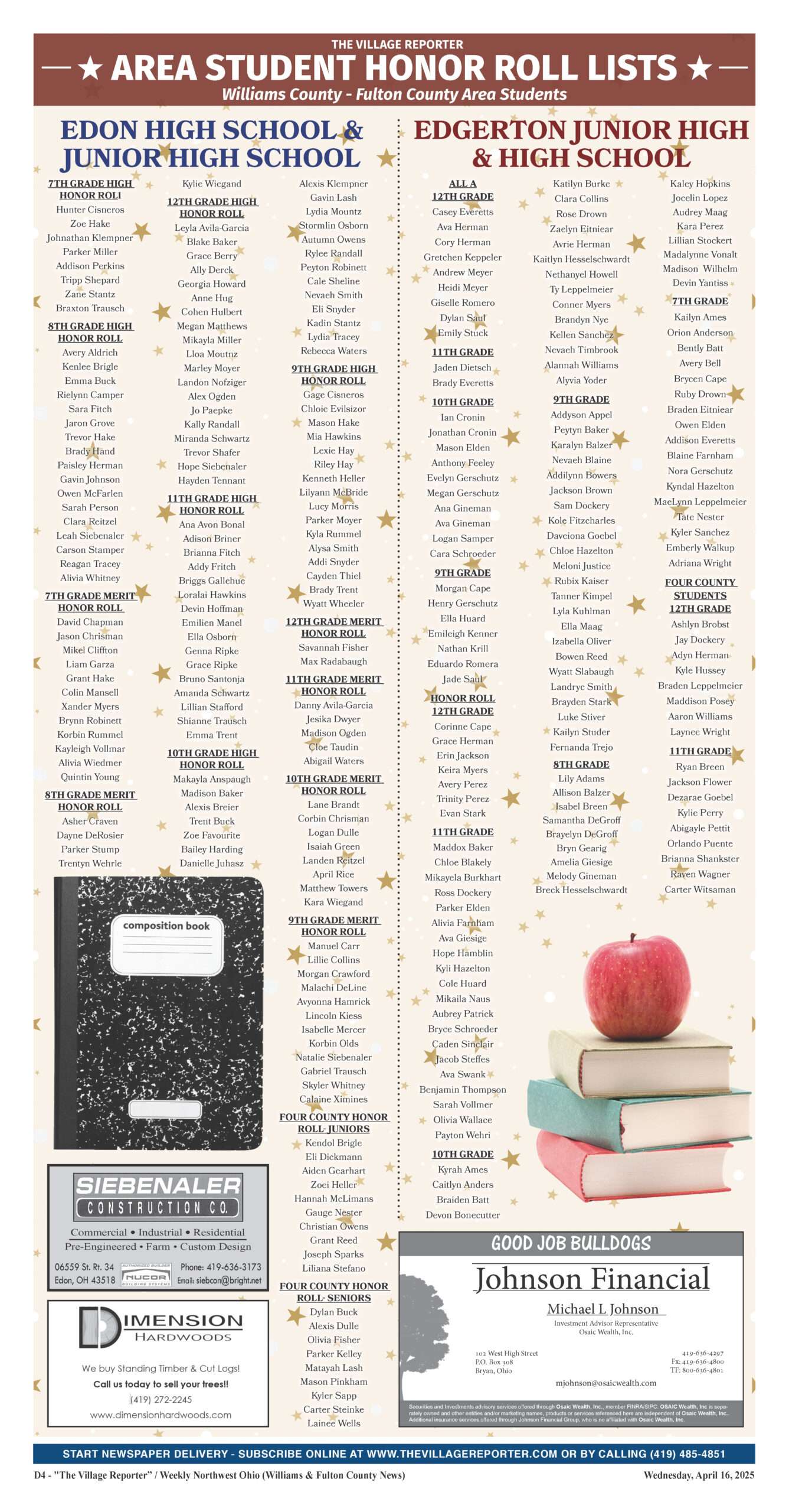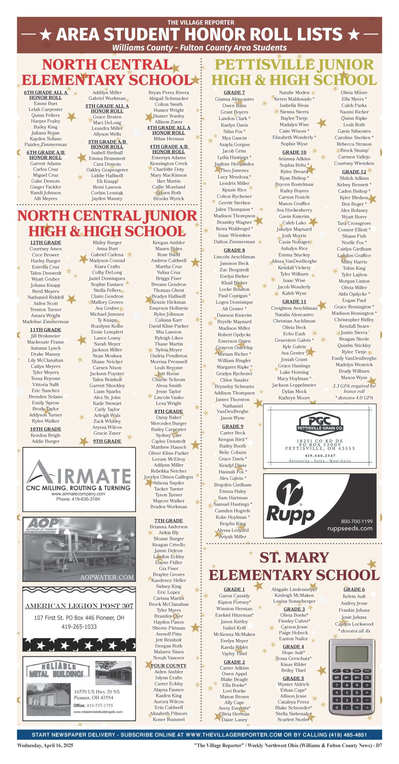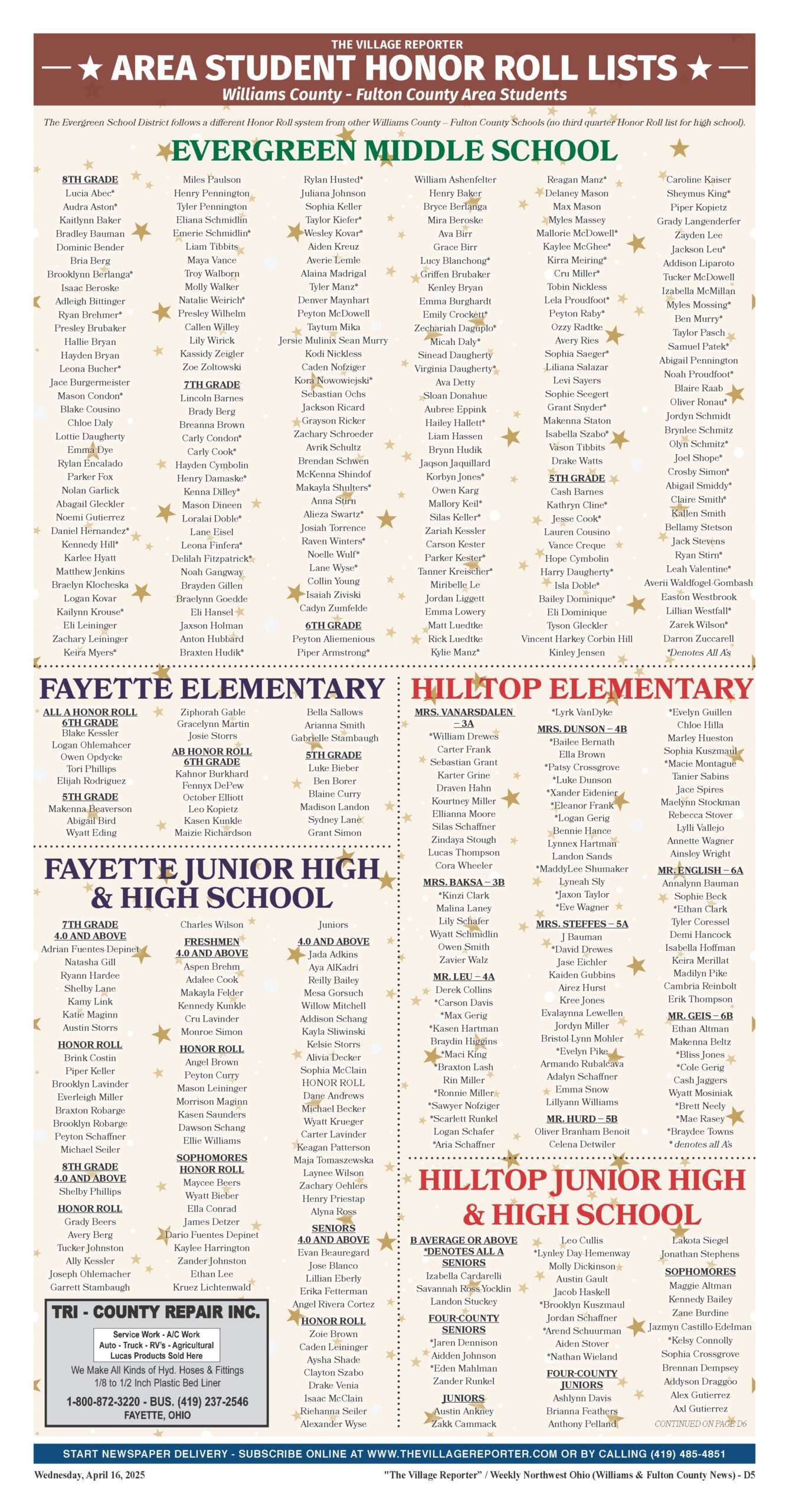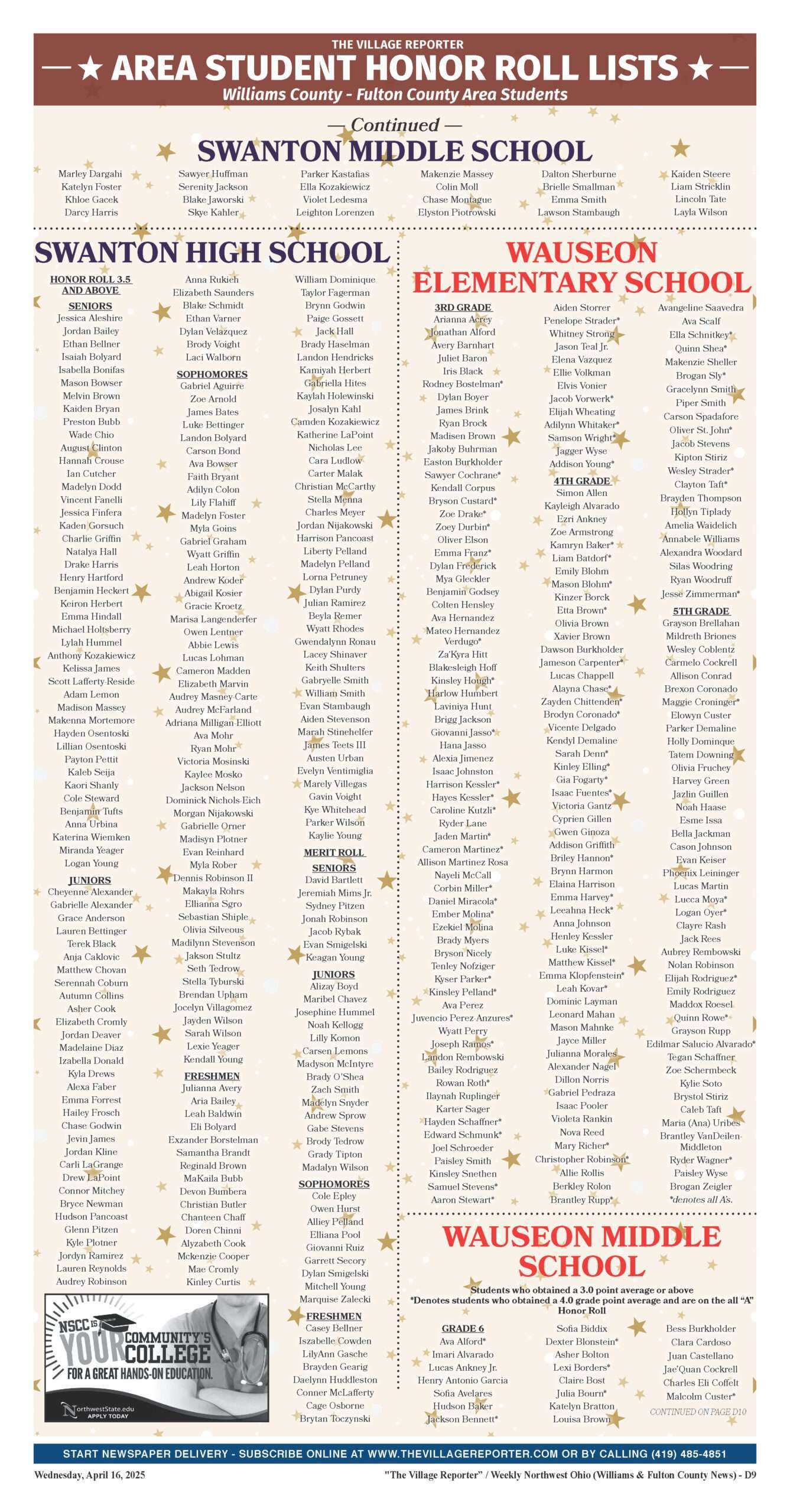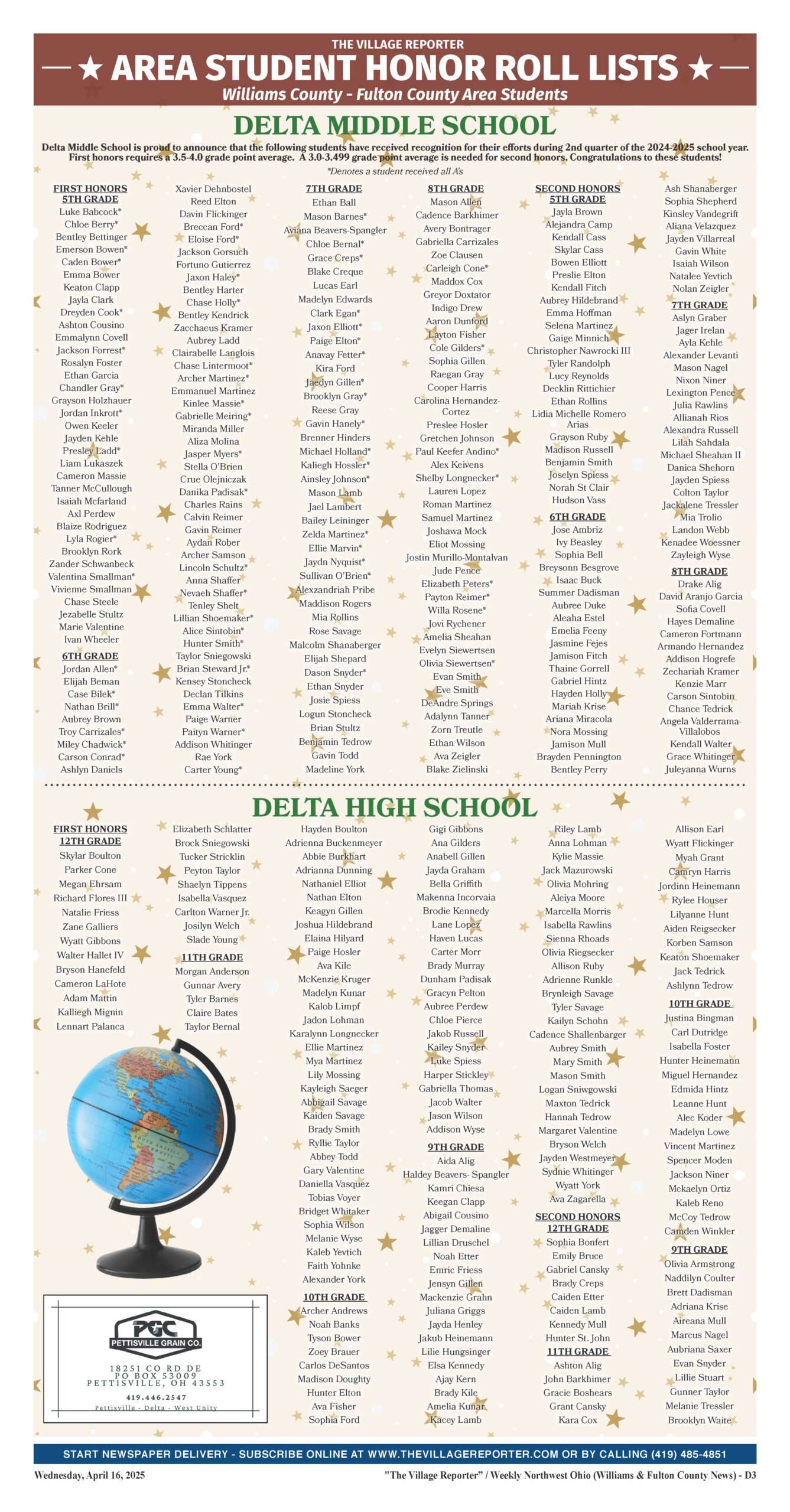 We are thrilled to present the Honor Roll for students across the Williams County and Fulton County area! Below, you’ll find 10 pages recognizing the hard work and dedication of these outstanding students.