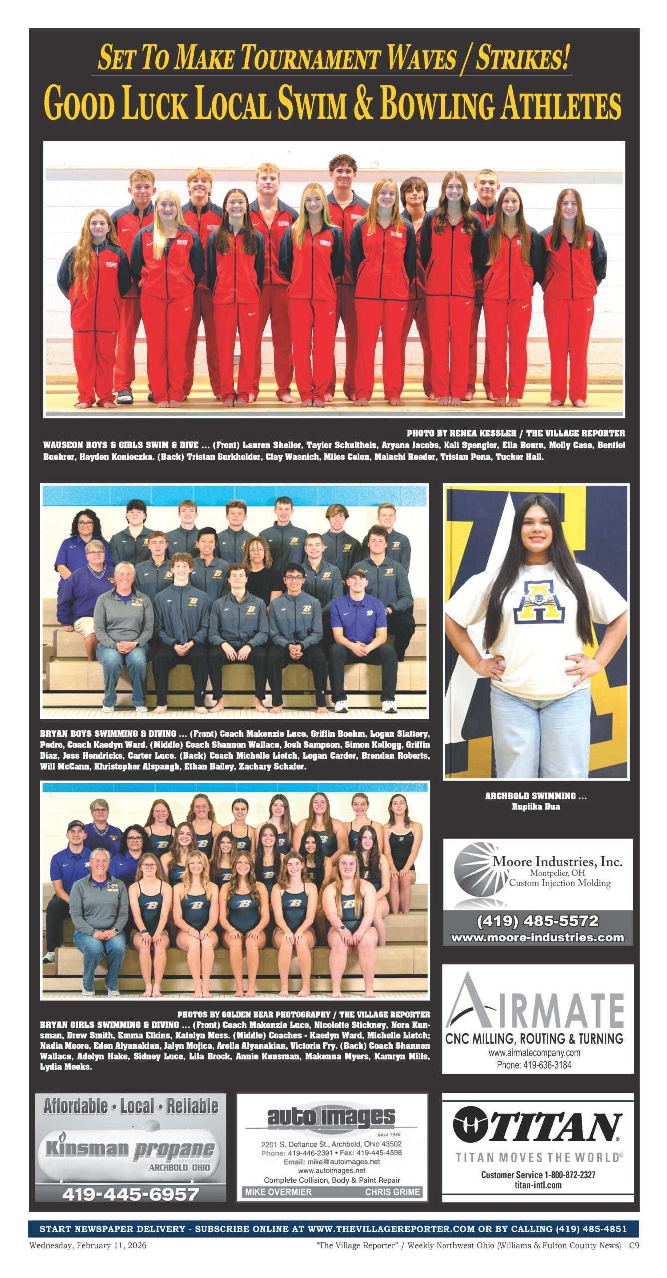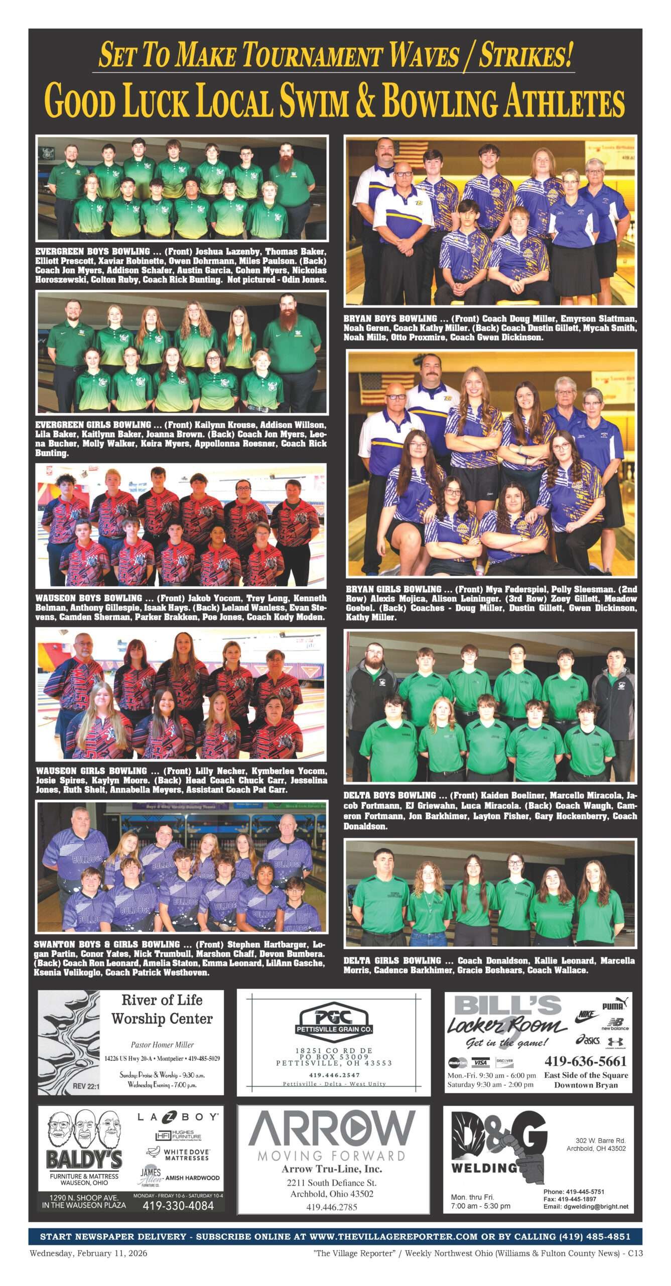 The Village Reporter is thrilled to spotlight the talented swim, diving, and bowling teams across our region as they prepare for upcoming tournament competition. From Bryan to Wauseon, Delta to Evergreen, and Swanton to Archbold, our local athletes are training hard and ready to make waves in their respective sports.