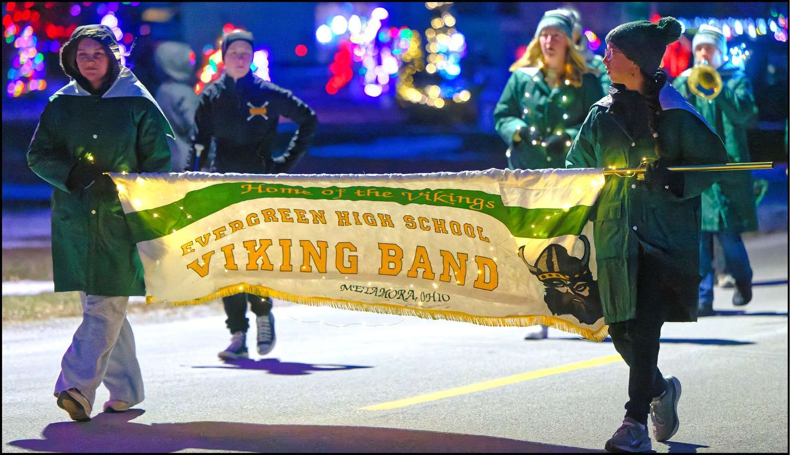 The parade featured a variety of entries decorated in holiday fashion, adding to the festive atmosphere throughout the village. The procession was led by the Honor Guard and the Evergreen Marching Band, whose music helped set the tone for the evening as the parade moved through downtown.