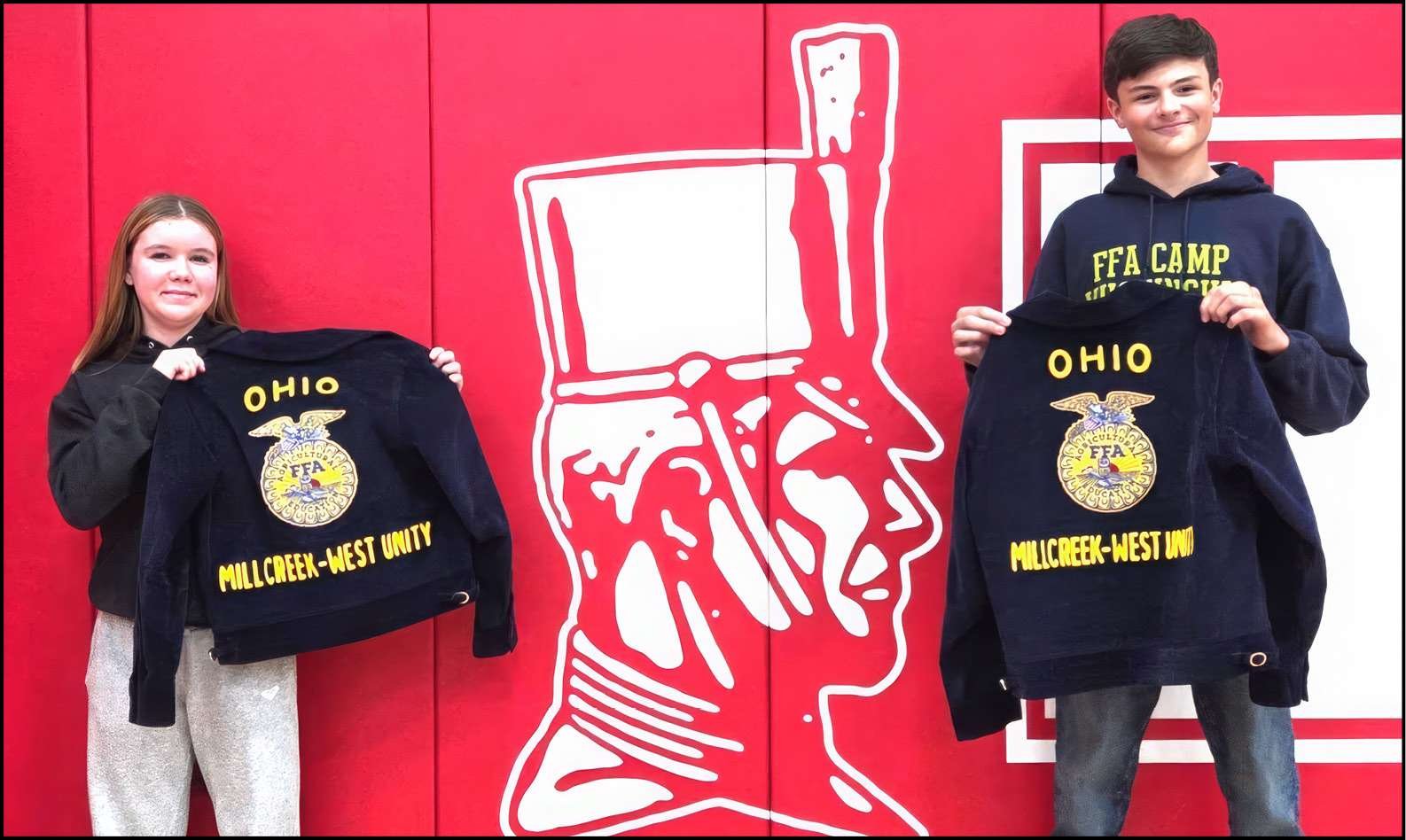 FFA JACKETS … The Ohio FFA Foundation again partnered with Beck’s Hybrids to offer the opportunity for members to apply for the symbolic FFA jacket. First-year members from across Ohio applied to receive the jackets as part of the Blue Jackets program, sponsored by these two organizations. Beck’s Hybrids is committed to helping provide FFA jackets for first-year members. With the generosity shared from community supporters and the Beck’s Hybrids dealer network, 366 FFA jackets were awarded to first-year Ohio FFA members this year. Millcreek-West Unity FFA members Cameron Marvin (right) and Avery Thompson (left) were two of those selected to receive their FFA jackets through Beck’s Hybrids program. Their jackets were sponsored by Laura Hannum of Trillium Farms in Johnstown, Ohio, and George Secor of Sunrise Cooperative, Inc in Fremont, Ohio.