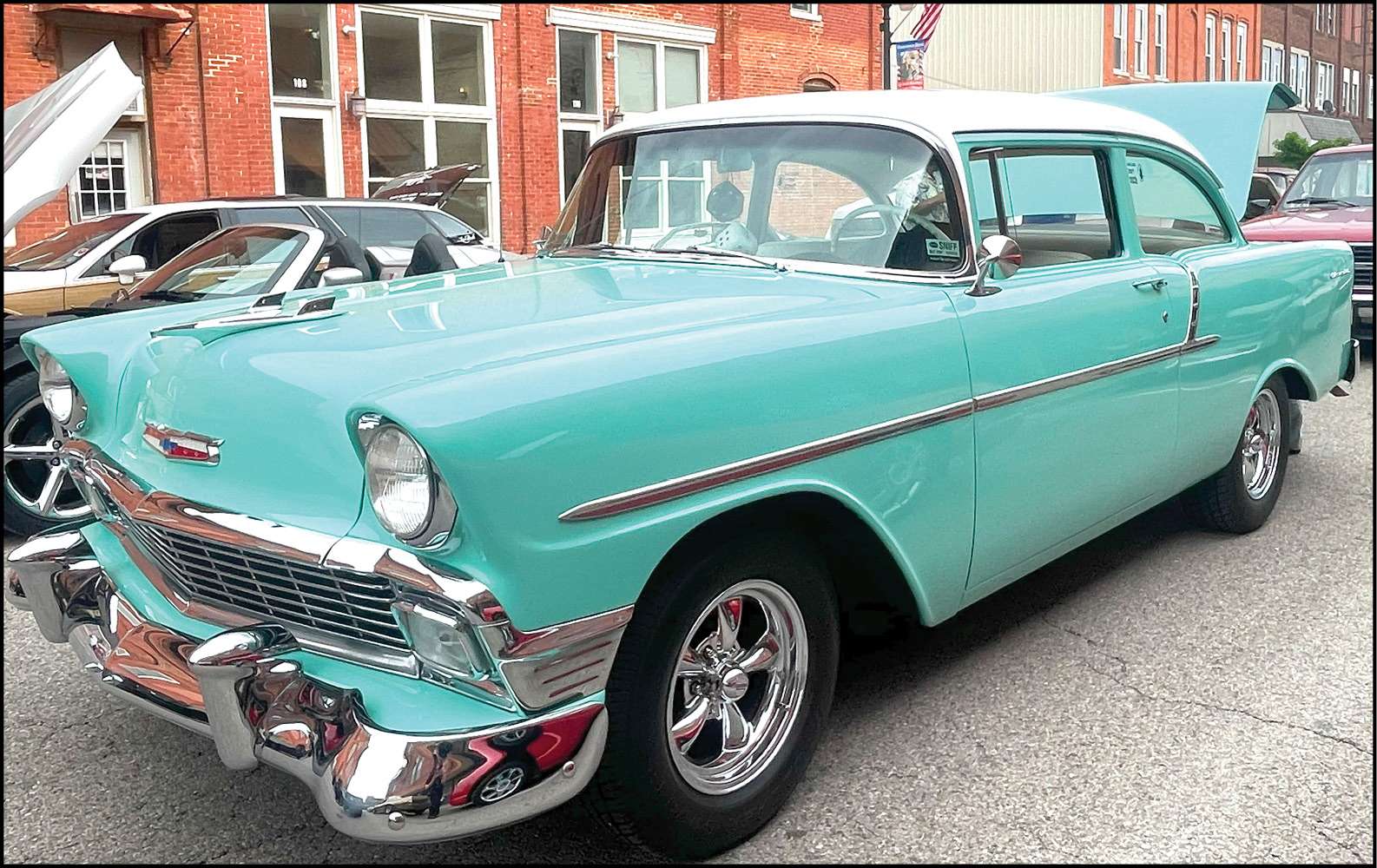 IMMACULATE … A shiny, teal 1956 Chevy Bel Air flaunts its pristine condition at the car show.