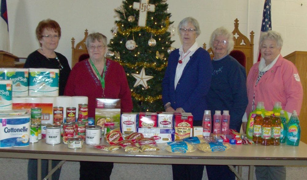 Canned goods, paper products, cleaning supplies and personal hygiene items were collected for Helping Hands local food pantry at the annual Christmas celebration luncheon held by CHWC-Montpelier Hospital Auxiliary Tuesday, Dec. 20th. Pictured with donated items are auxiliary members, from left to right, Jan Follett, Lorna Myers, Dorothy Briner, Ruth Cooley, and Carol Eriksen, Vice President. The luncheon meeting was held at First Presbyterian Church, Montpelier, catered by ladies of the church—Jean Darby and Sharon Crowe. Rev. David Tilly also attended. Following the luncheon, President Armeda Sawmiller conducted the business meeting. A moment of silence was observed for the passing of auxiliary members Doris Dilworth and Linda Lewis. Treasurer Barb Dietsch presented a candlelight Christmas memorial with white rose honoring deceased members. Roll call was taken sharing a special Christmas wish for someone else. Christmas cards were collected for the hospital card shower and patient favors, a variety of Christmas ornaments, delivered by Joyce Schelling for December. President Armeda thanked all who assisted with the annual “Lighting the Way to Christmas” memorial program held Dec. 4th and Book & Gift Fair held Nov. 29th. Due to the New Year’s holiday, executive board members will meet Tuesday, Jan. 3rd at 10:30 a.m. at the Montpelier hospital conference room. The next regular auxiliary meeting is scheduled for Monday, Jan. 9th at 1:00 p.m. with guest speaker Montpelier Chief of Police Dan McGee. Roll call will be “What is something you remember getting in trouble for when you were young?”. Guests are welcome to attend.
