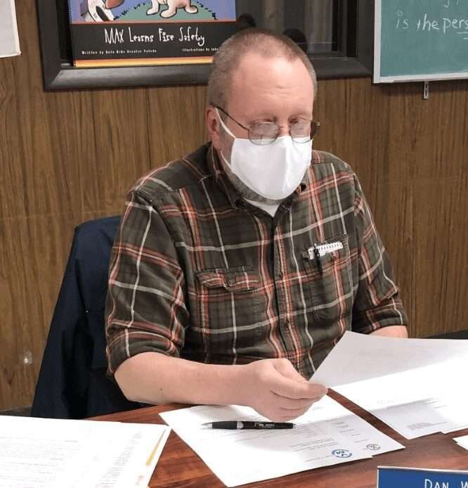 PRE-MEETING PREP … Before the meeting begins, as others are arriving, members are often seen going through the packet of business for the evening. Montpelier Council Member Dan Willis was doing so on Monday evening, March 8, 2021. (PHOTO BY REBECCA MILLER, STAFF)