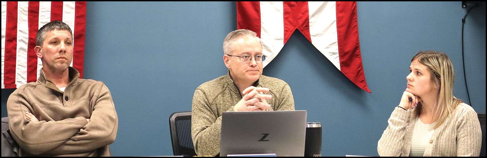 CONCERNS STATED … Council President Chris Kannel shares concerns of the R3 triplex proposal from the Port Authority, while Deputy Manager Justin Houk and Clerk Molly Collert listen.