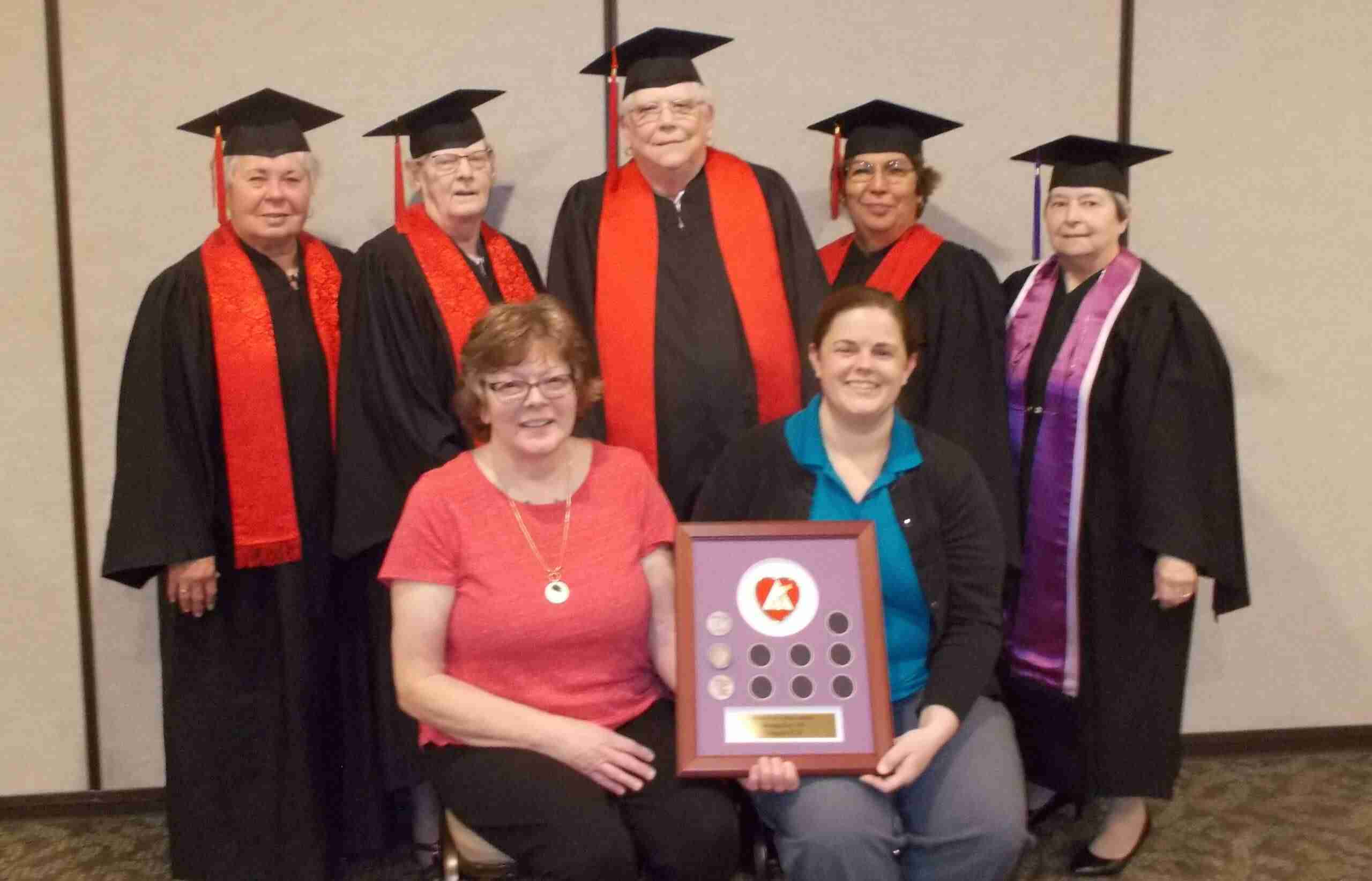 Montpelier Chapter 270, Women of the Moose, held College of Regents chapter night Thursday, Nov. 5th which included the Award of Achievement presentation ceremony. Members holding the College of Regents Degree, the highest degree in the organization, were honored during the meeting. Shown from left to right, seated, are Green Cap Junior Graduate Regent Melinda Evers and Past Regent and Recorder Kara Custar, both holding the Award of Achievement plaque; back row, standing from left to right, Collegians Pat Fitzcharles, Lee Hart, Pat Cogan serving as Higher Degree Committee chairman, Past Deputy Grand Regent Rey McKinney serving as secretary/treasurer, and Past Grand Council Member Joyce Schelling. J.G.R. Melinda presented the chapter’s 2019-2020 Award of Achievement as she served the chapter as senior regent this past year.