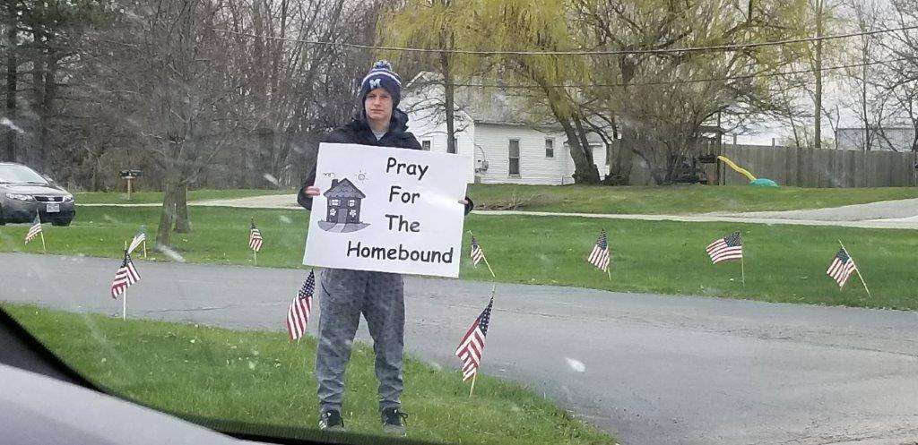GOOD FRIDAY EVENT … Standing in front of Evergreen Healthcare Center in Montpelier on a cold Good Friday, April 10, 2020, is Braden Saneholtz. His sign says Pray for the Homebound, and he was one of fourteen volunteers who participated in the 2020 Good Friday Prayer Cruise, by holding a sign while families and individuals paused to pray.