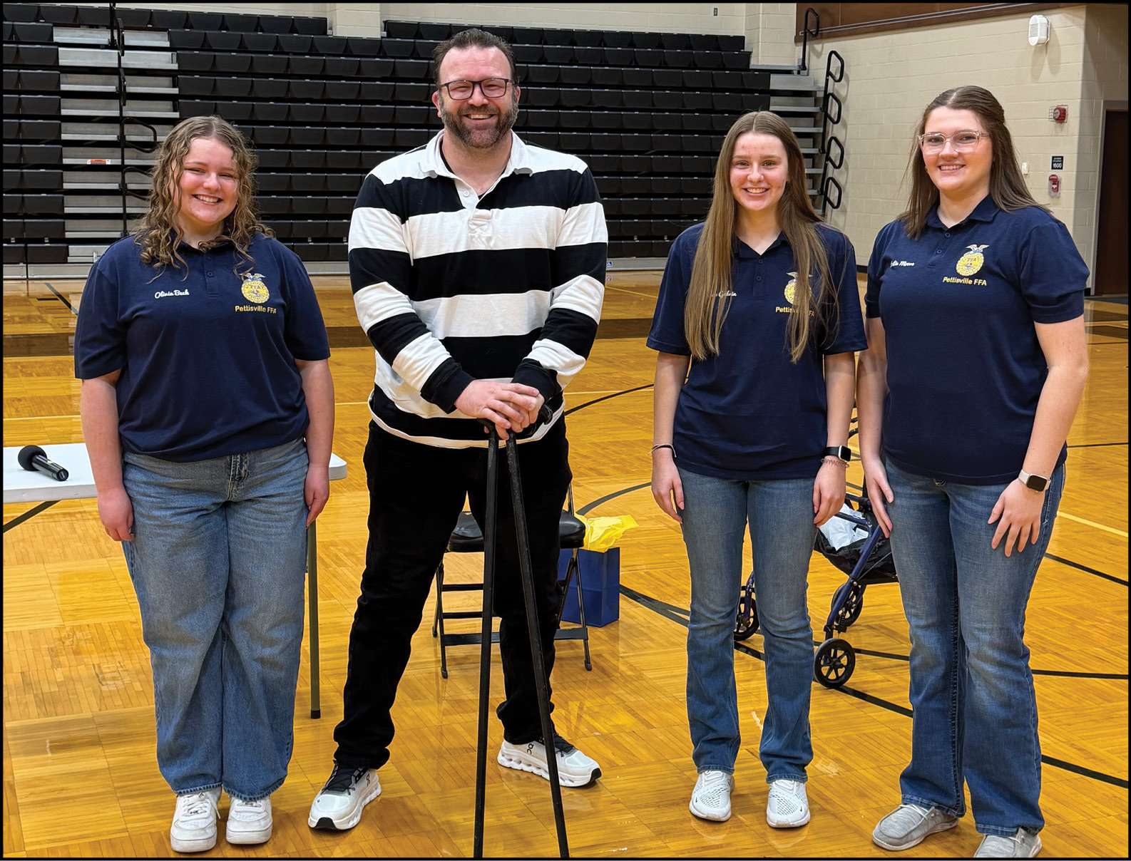 SPEAKER … Pettisville FFA Healthy Lifestyles Committee Members Olivia Beck, Genevieve Galvin, and Katie Moore planned a motivational assembly featuring speaker Brock Mealer (second from left) to inspire students in grades 5-12 at Pettisville School on February 10, 2026.