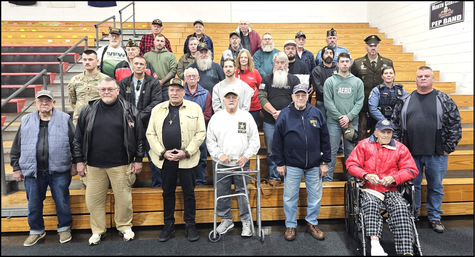 VETERANS PROGRAM … North Central Elementary students paid tribute to local veterans on November 11, 2025, presenting a heartfelt program featuring patriotic songs and recognition of all military branches. Their celebration echoed similar ceremonies held by schools across Williams and Fulton Counties in Northwest Ohio. Pictured are local veterans gathering for a community photo following the event.
