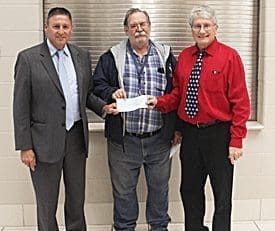 SUPPORTING THE PROJECT … Denny Baer, center presented a check from the Bryan Eagles in the amount of $5,000 as a donation for the new Hilltop weightroom equipment. Left to right: Jim Wyse, Superintendent, Denny Baer, Bryan Eagles, and Don Leu, teacher and Bryan Eagles member. (PHOTO PROVIDED)