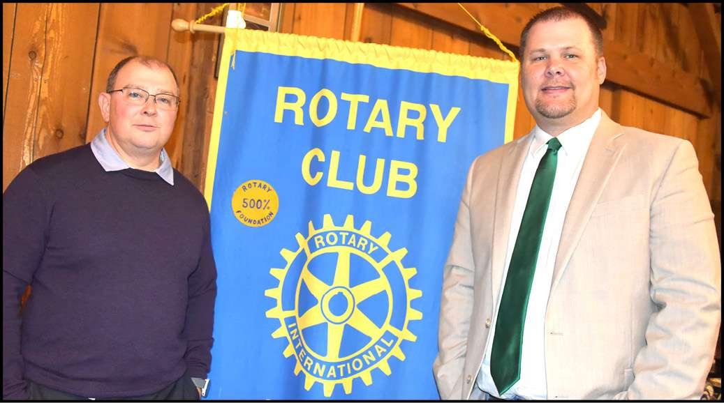 KEEPING COLLEGE AFFORDABLE … Northwest State Community College President Todd Hernandez (left) told Archbold Rotarians that he expects to end the current school year with more than 8,000 students enrolled either as traditional full- or part-time students, high school students participating in College Credit Plus coursework or the school’s largest program — workforce development. Some 40 percent of their students have their classes completely paid for through a variety of scholarships, employer tuition reimbursement or school district funding for students who participate in the College Credit Plus courses. The remaining students pay $109 per credit hour. The program was arranged by Rotarian Darin Seiler (right).