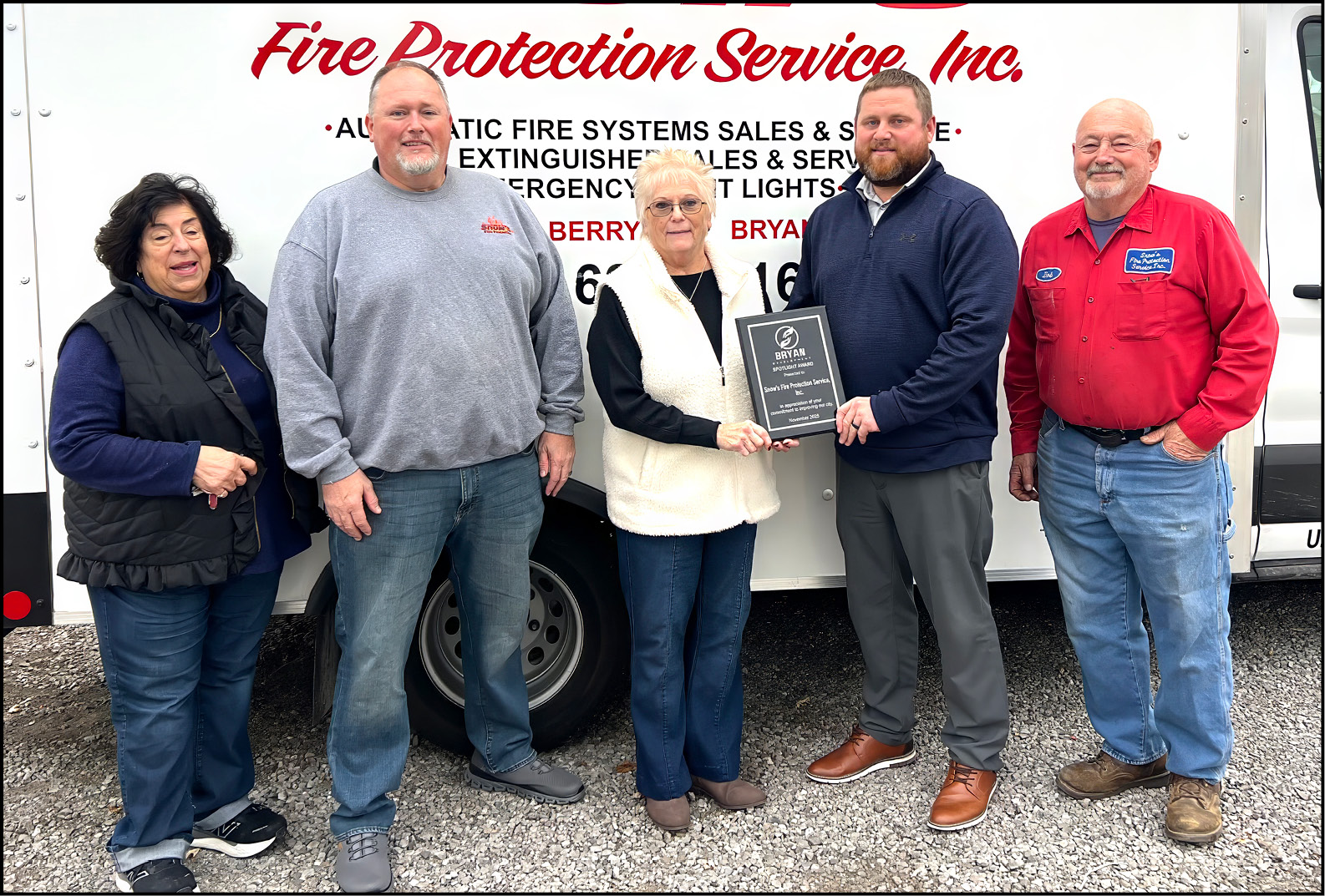 PRESS RELEASE – To recognize local investments in buildings, landscaping, events and other accomplishments, Bryan Development has created a “Spotlight Award.” November’s Spotlight Award goes to Snow’s Fire Protection Services, Inc., as they celebrate 60 years of business.