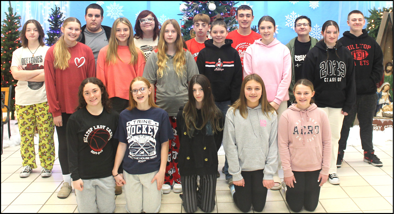 STUDENTS HONORED … The following students are November students of the month for Hilltop High School/Junior High. (Front) Carlee Schaffner, Rachel Dickinson, Kaydence Stough, Demi Hancock, and Tessa Jones. (Middle) Caelan Nofziger, Braydee Towns, Amelia Culbertson, Lillian Snow, Tina Dickinson, and Ahlea Jody. (Back) Lynley Day-Hemenway, Connor Prater, Hannah Willson, Gavin Smith, Bryce Peters, Brayden Tyler, and Nate Waue.
