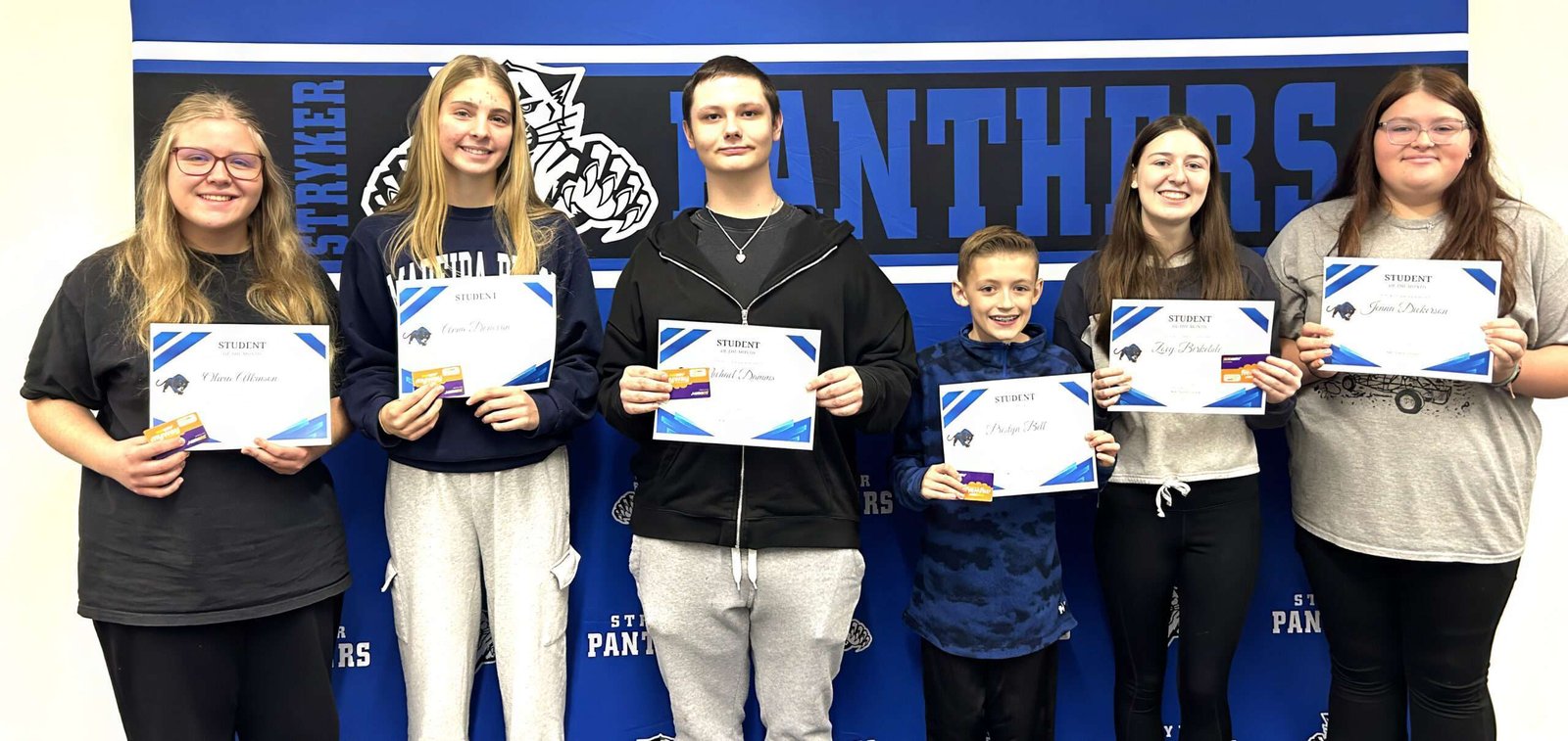 STUDENTS HONORED … November Students of the Month at Stryker High School showed the trait of Courage. Pictured are (L-R) Olivia Atkinson (Senior), Anna Donovan (Sophomore), Michael Damms (Junior), Prestyn Bell (7th grade), Zoey Berkebile (Freshman), and Jenna Dickerson (8th grade).