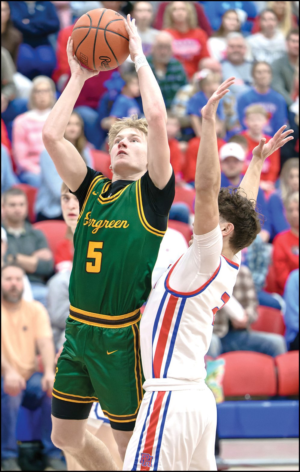 Another long triple by Ruetz knotted the game at 33-all. Then an Allendorf steal-and-feed to Ruetz put Evergreen back up with 5:21 to go in the third. Evergreen never trailed again.
