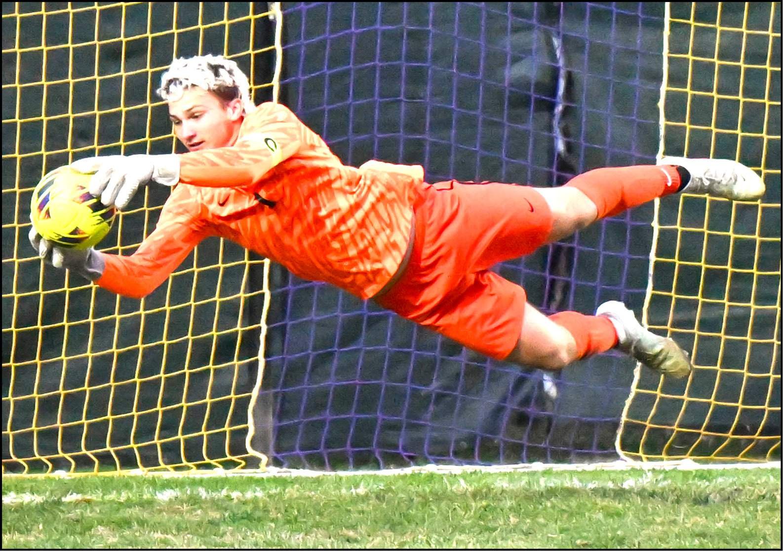 DIVING STOP … Evergreen goalkeeper Alex Mossing lays out to stop one of Bryan’s 17 shots on goal as part of a 34-shot night.