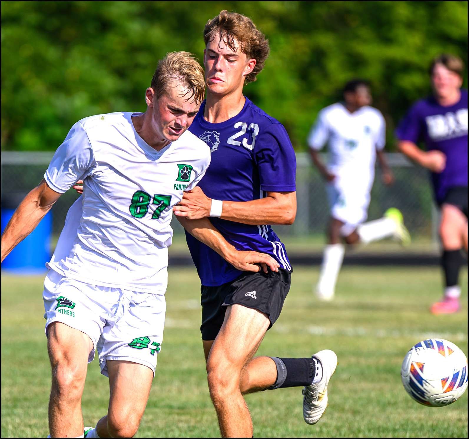 BATTLE FOR POSSESSION … Delta’s Eli Armstrong (left) and Swanton’s Evan Reinhard both try to get possession of the ball during an NWOAL match in Swanton.