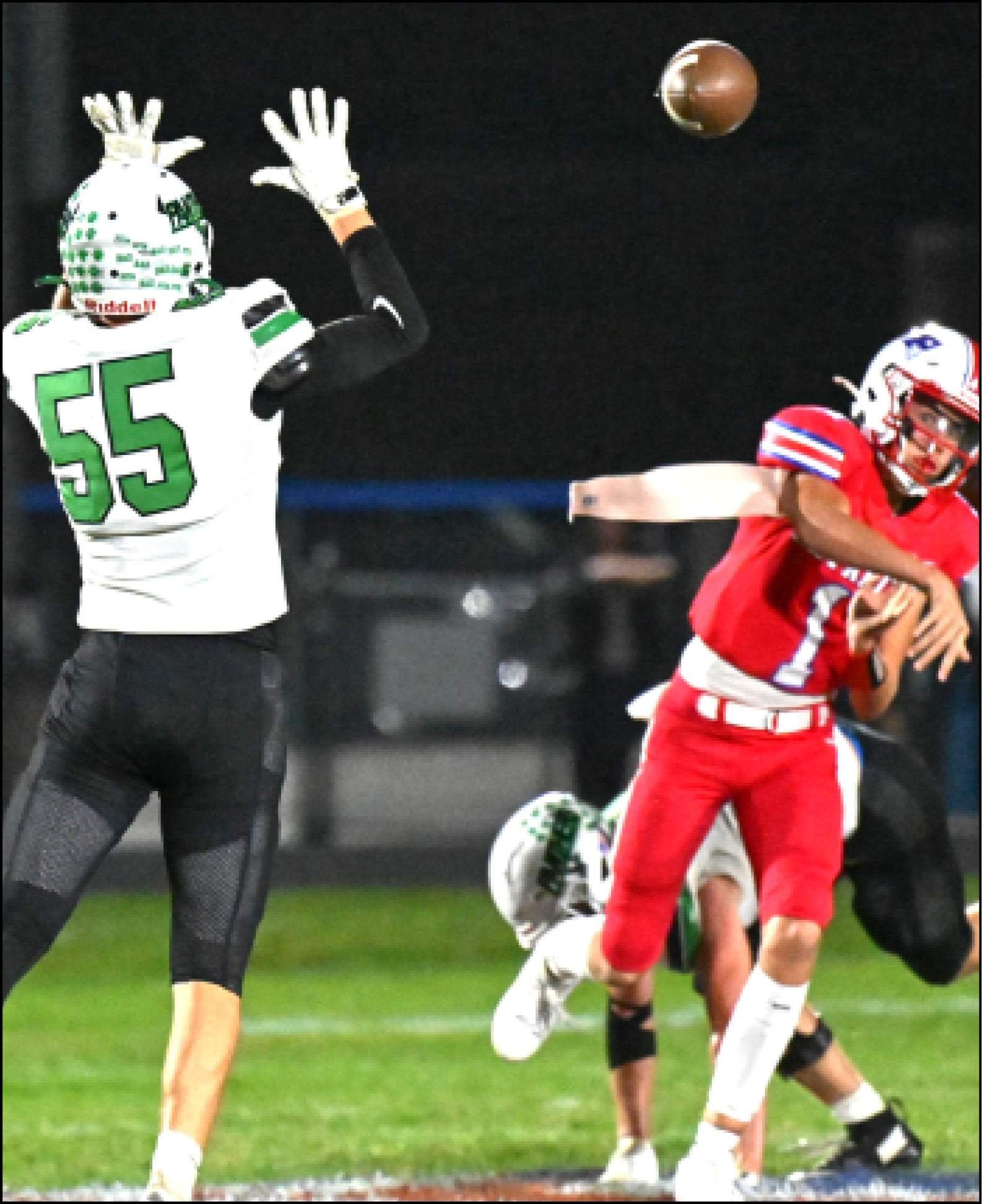 PASS DEFENSE … Delta defensive end Wyatt Flickinger leaps to knock down the pass of the Patriot quarterback.