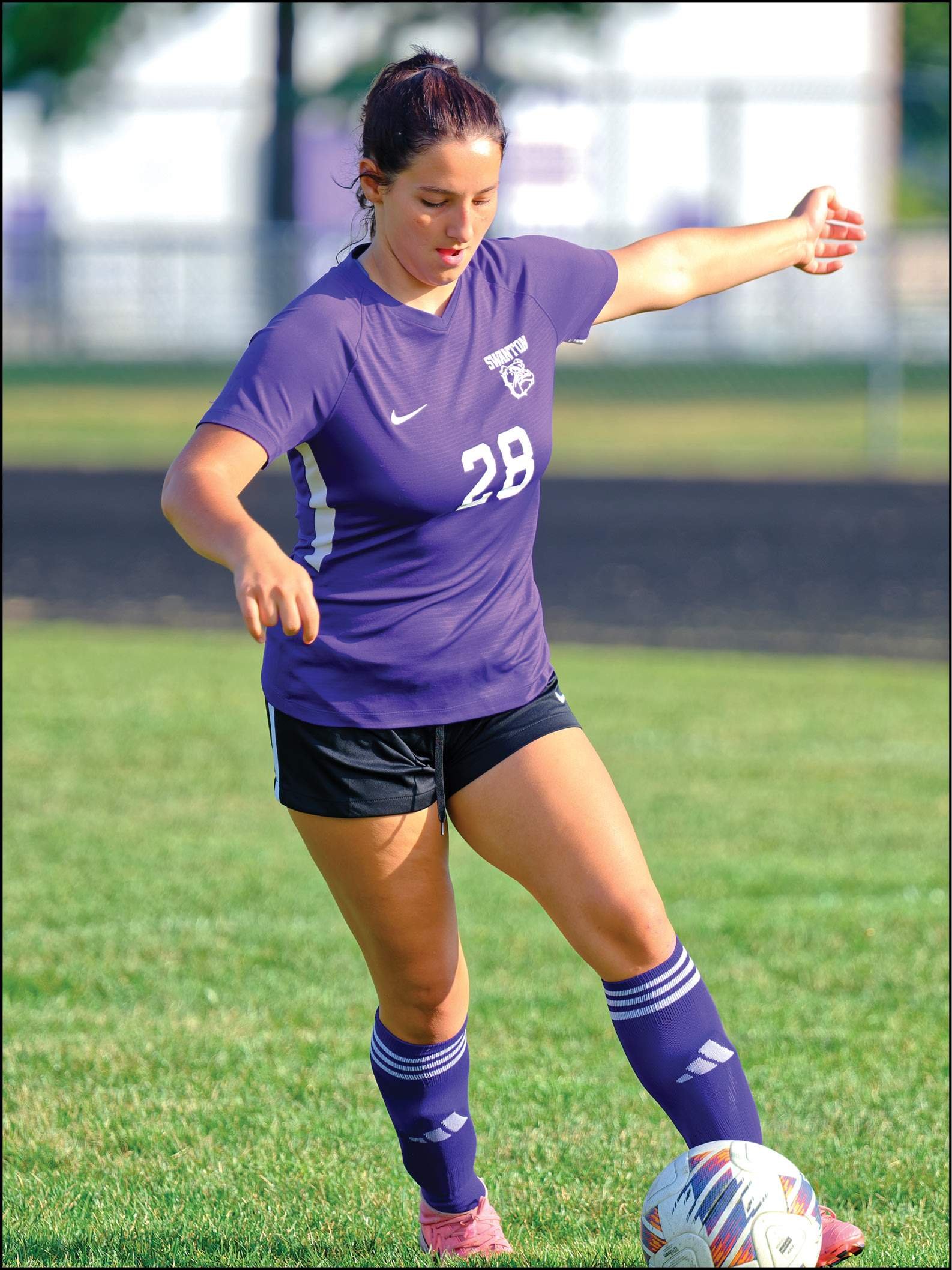 NWOAL GIRLS SOCCER … Swanton defender Emily Reed works with the ball in the open field.