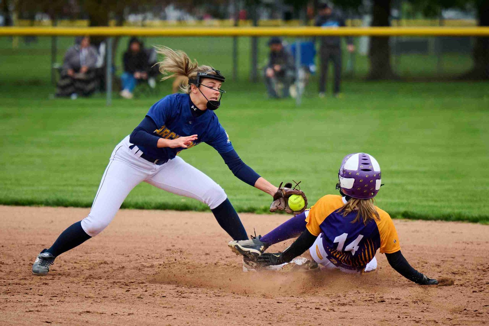 STOLEN BASE … Archbold shortstop Emma Hall takes the throw from the catcher as they try to catch Bryan’s Tabithah Taylor stealing second. (PHOTO BY RICH HARDING, STAFF)