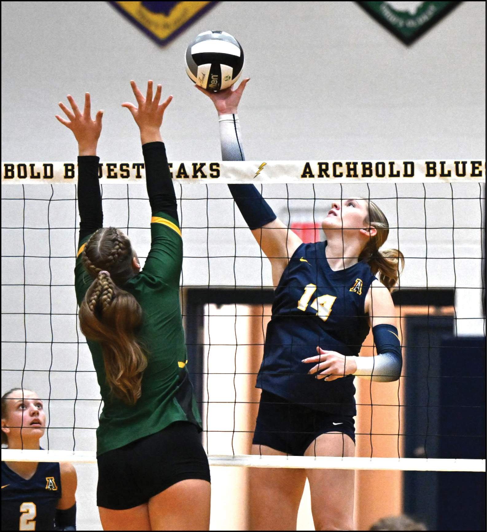 UNBEATEN IN LEAGUE … Archbold’s Lexi Ripke looks to finish off a point in last week’s home win over Evergreen as Archbold remained undefeated in NWOAL play.