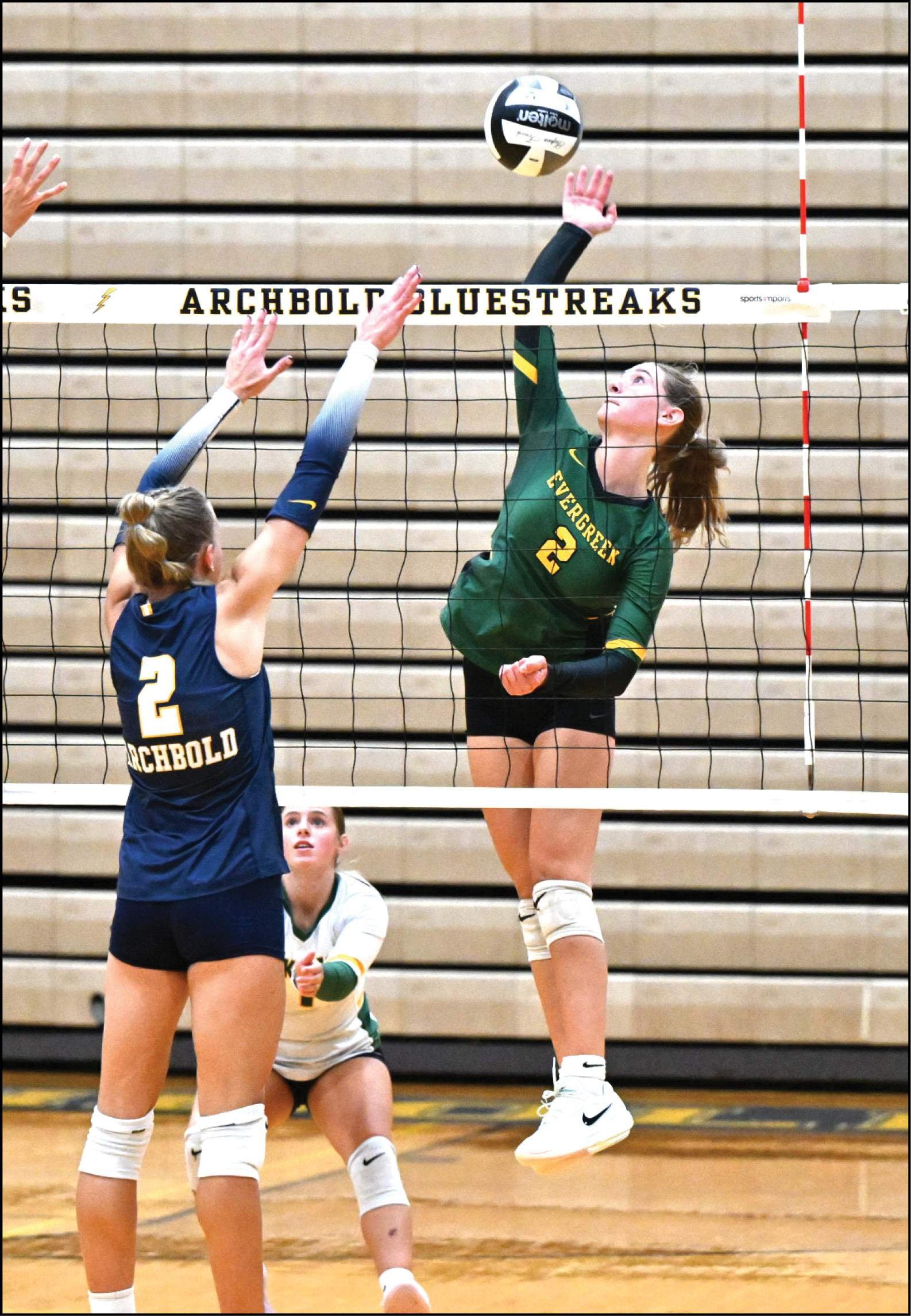 LEAGUE MATCH … Evergreen outside hitter Lanae Manz attempts a spike in NWOAL play at Archbold.
