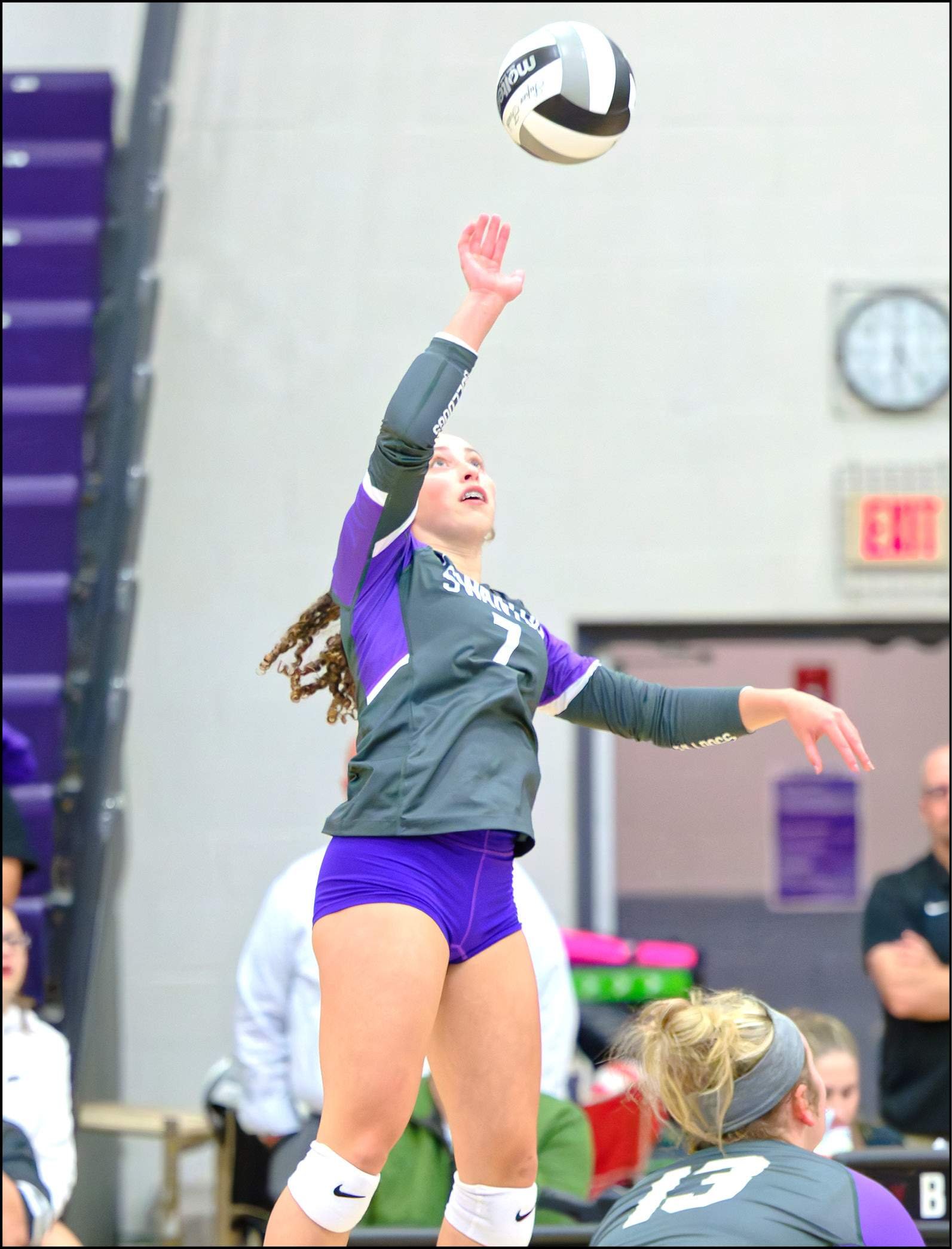 BIG NIGHT … Swanton’s Kinley Curtis, shown elevating for a kill, went 54/58 hitting and racked up 29 kills on the night.